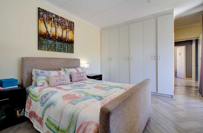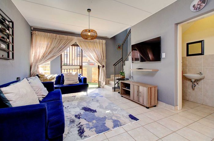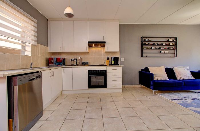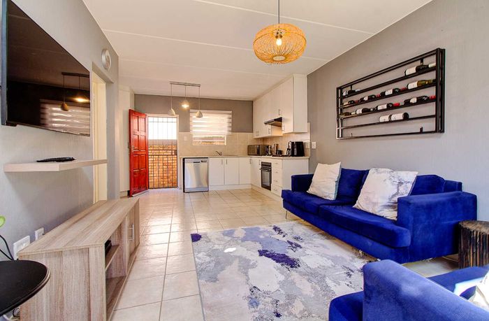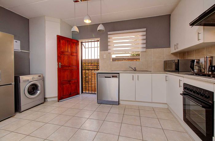 Modern two-bedroom townhouse in Wilgeheuwel, Roodepoort, featuring en-suite, open-plan living, double garage, pet-friendly garden, and low levies.