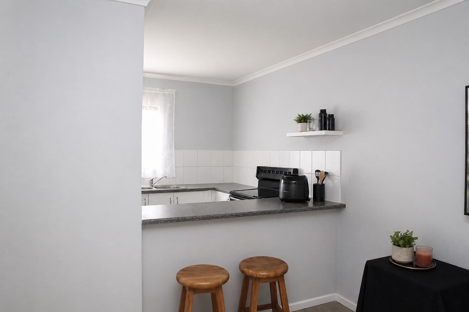 This home has been recently retiled and freshly painted, radiating a modern charm that's sure to captivate you. Inside, you'll find two cozy bedrooms alongside a contemporary bathroom featuring a sleek shower. The open-plan layout effortlessly connects the lounge, kitchen, and dining areas, creating an inviting space that's ideal for both relaxing and entertaining. A well-sized patio leads onto a private garden.