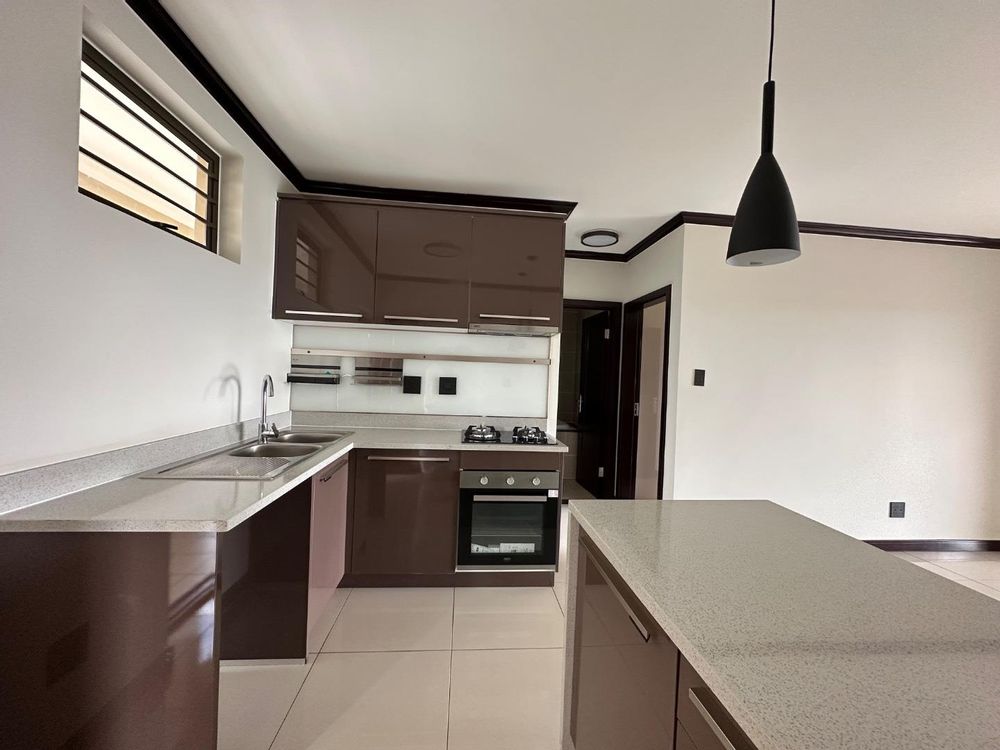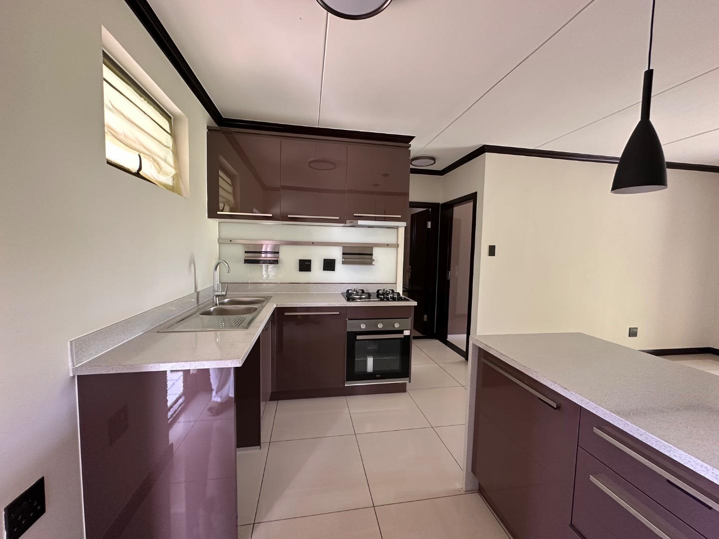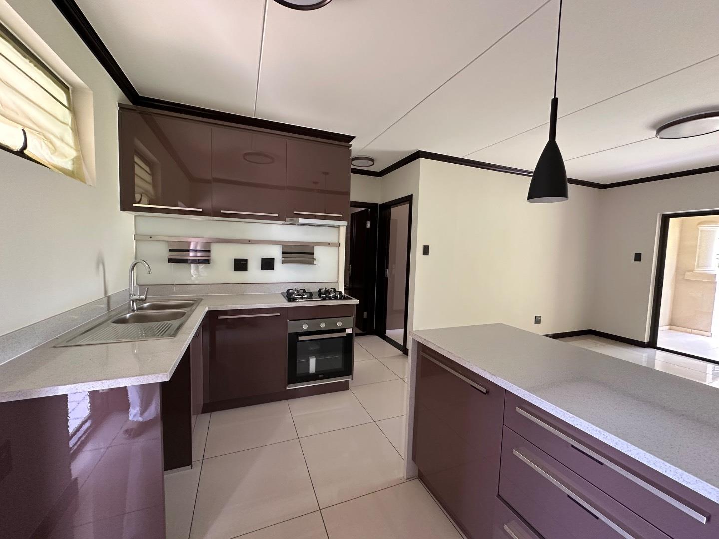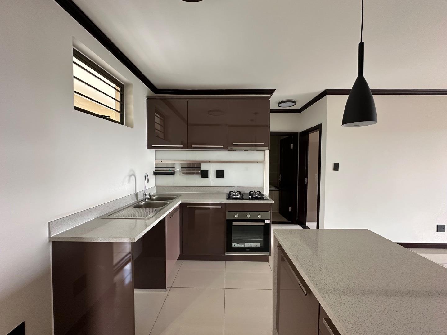 Stylish Open-Plan Kitchen with glossy cabinetry, stone countertops & built-in oven + gas hob