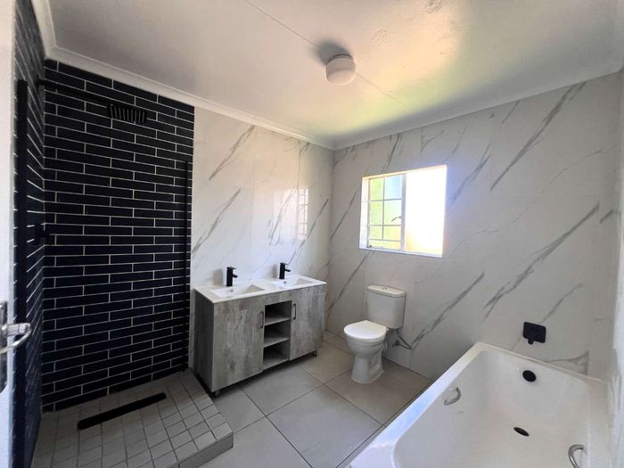 Three-bedroom, two-bathroom townhouse with double garage and 128 m² floor size. Pet-friendly garden and backup inverter included.