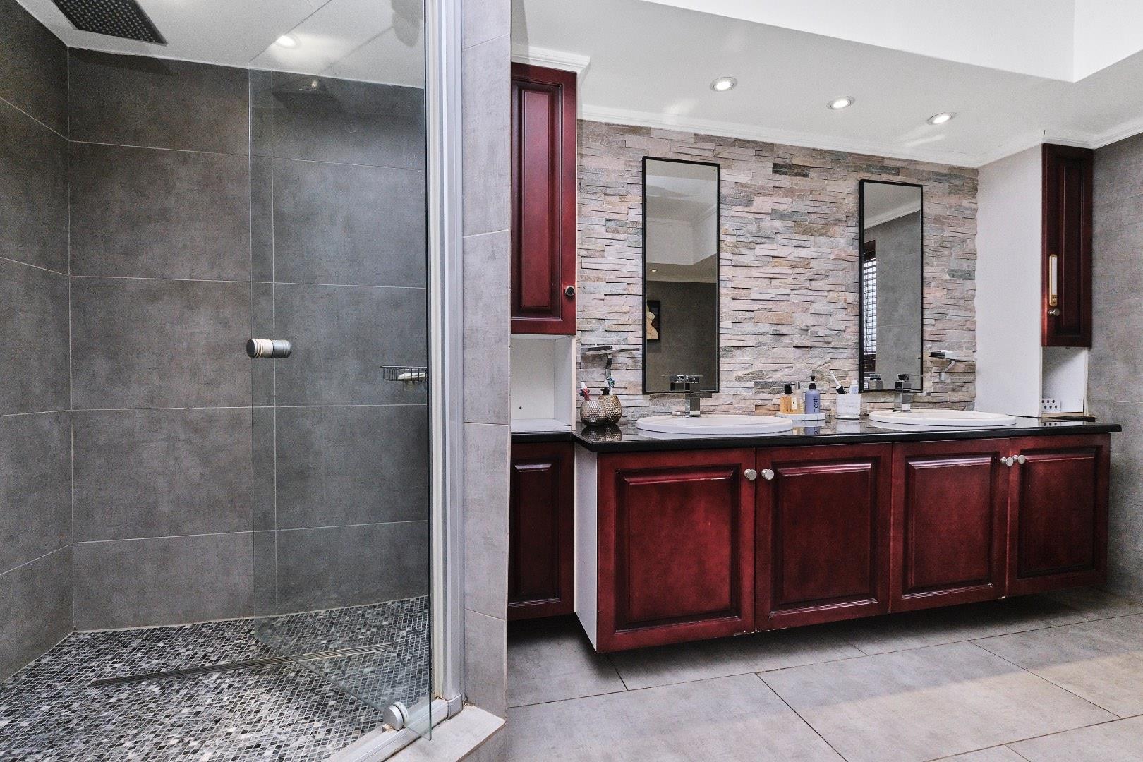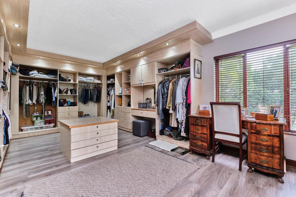 This multi-level home boasts five double bedrooms, each with built-in cupboards. Among the three bathrooms, two are en suite. The master suite is a true retreat, featuring a luxurious walk-in closet.