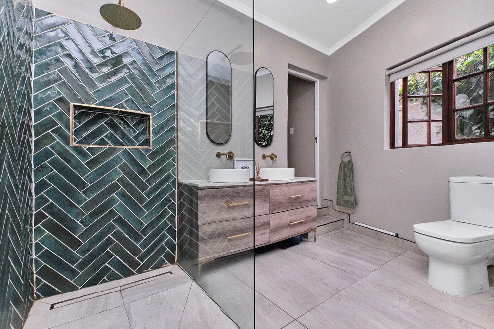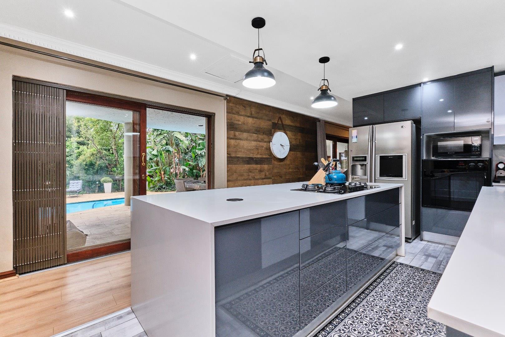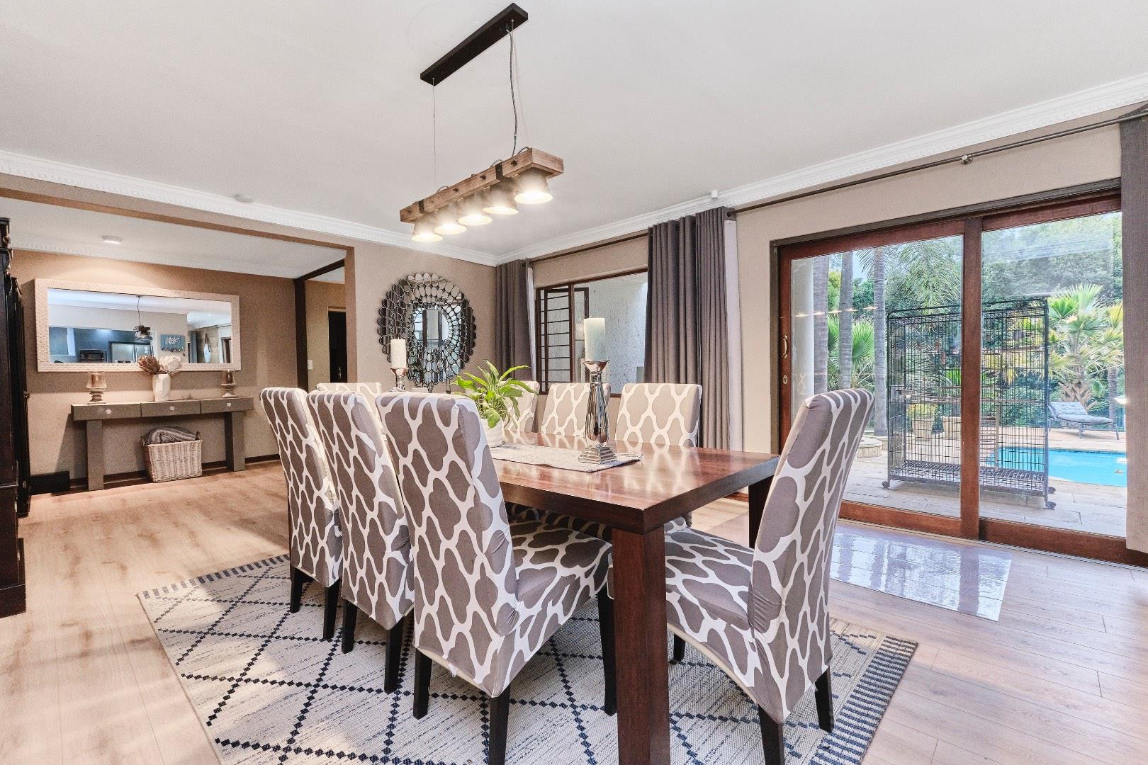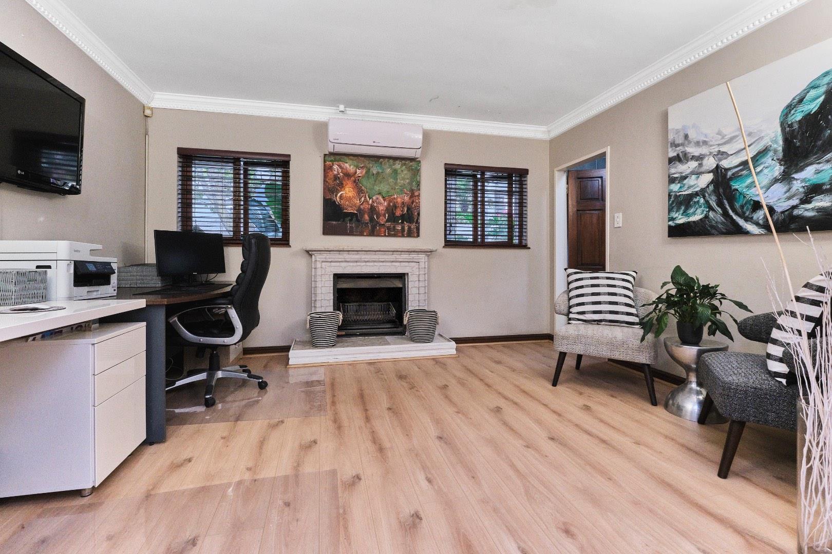 The home's modern kitchen is a culinary delight, equipped with a separate scullery, space for three appliances, a double fridge, gas hob, and electric oven. Adorned with elegant quartz countertops, it serves as the hub of family life. The living space offers two inviting lounges, one with a cozy fireplace, and a dining room that opens directly onto the patio. A study and a guest loo complete the main level's accommodations.