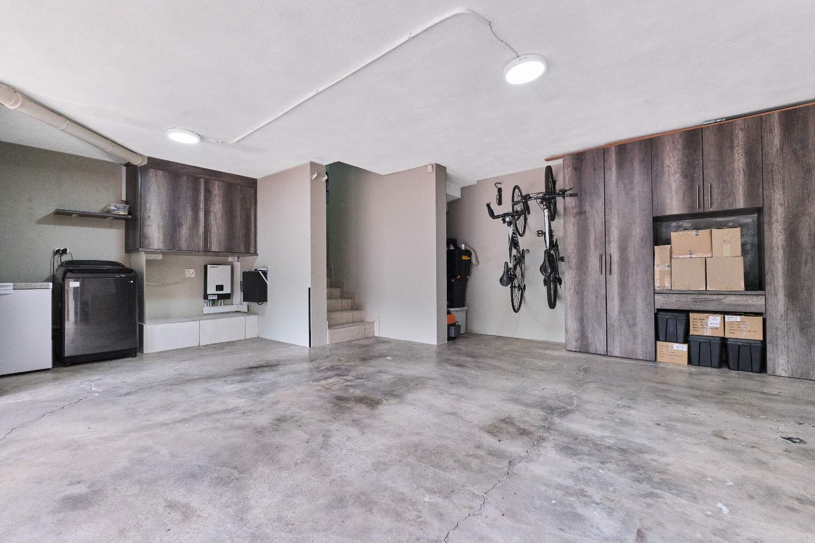 The heart of this home is its modern kitchen, featuring sleek granite countertops and ample cupboard space. Equipped with a gas hob, cooker hood, electric oven, and a Hitachi built-in fridge, it’s perfect for the discerning home chef. The kitchen also accommodates a dishwasher, while a separate laundry area is conveniently located in the garage.