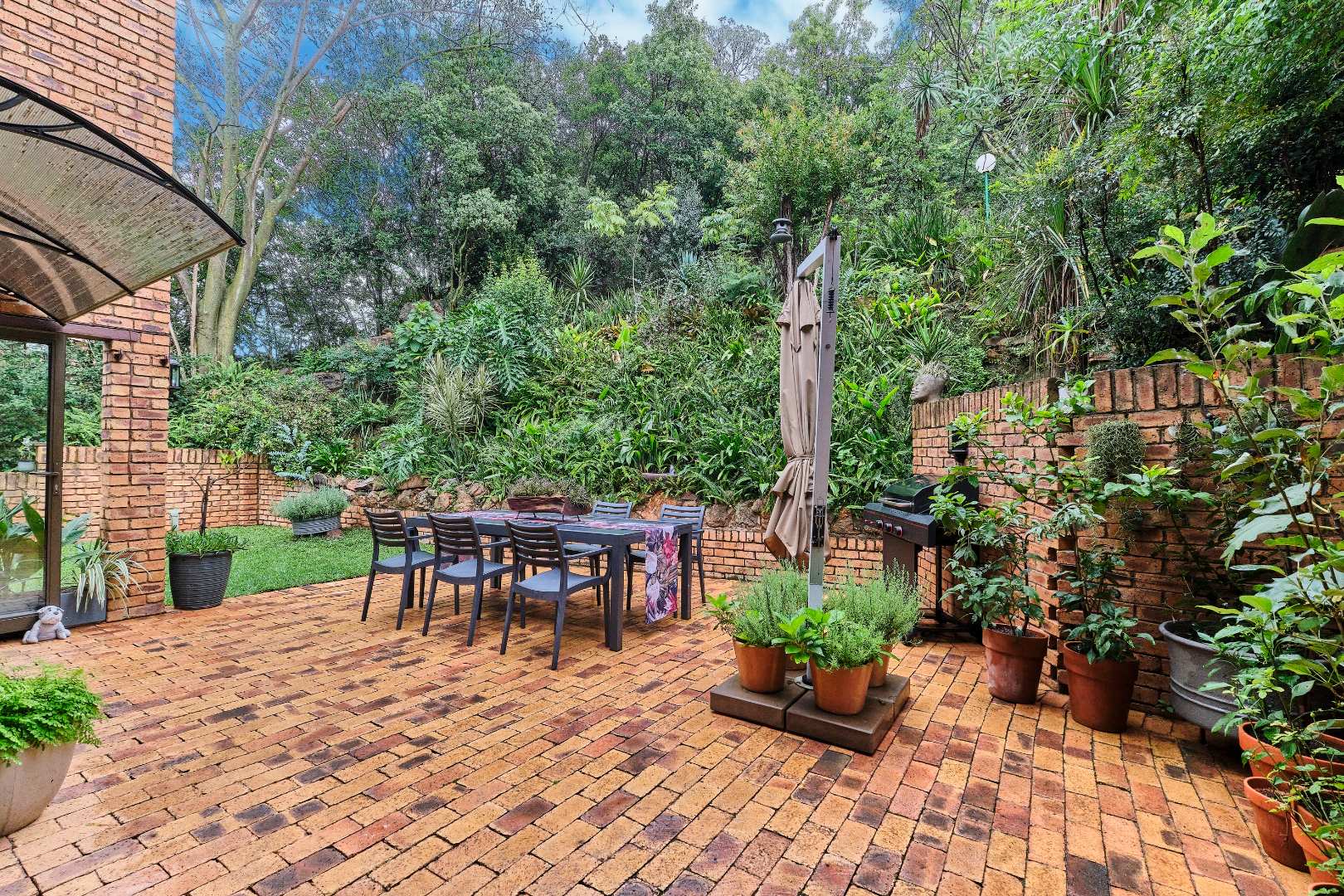 The open-plan design allows for seamless flow from the kitchen into the dining and lounge areas. These spaces open up through stacking doors onto a charming patio and garden with an irrigation system, ideal for entertaining guests or enjoying family time. For added convenience, a guest loo is located downstairs.