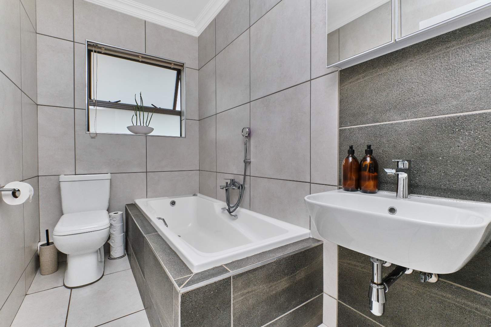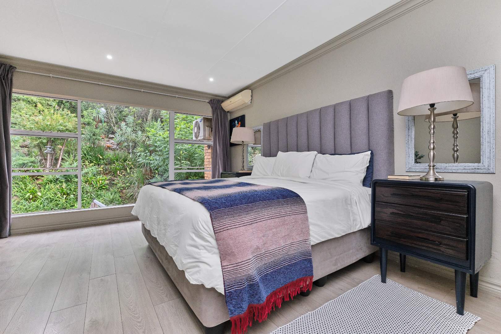 Upstairs, you’ll find three spacious bedrooms. The luxurious main suite is a true retreat, featuring an air conditioner, a private balcony with stunning views of the garden and koppie, and an elegant, modern full bathroom. The second and third bedrooms share a well-appointed guest bathroom.