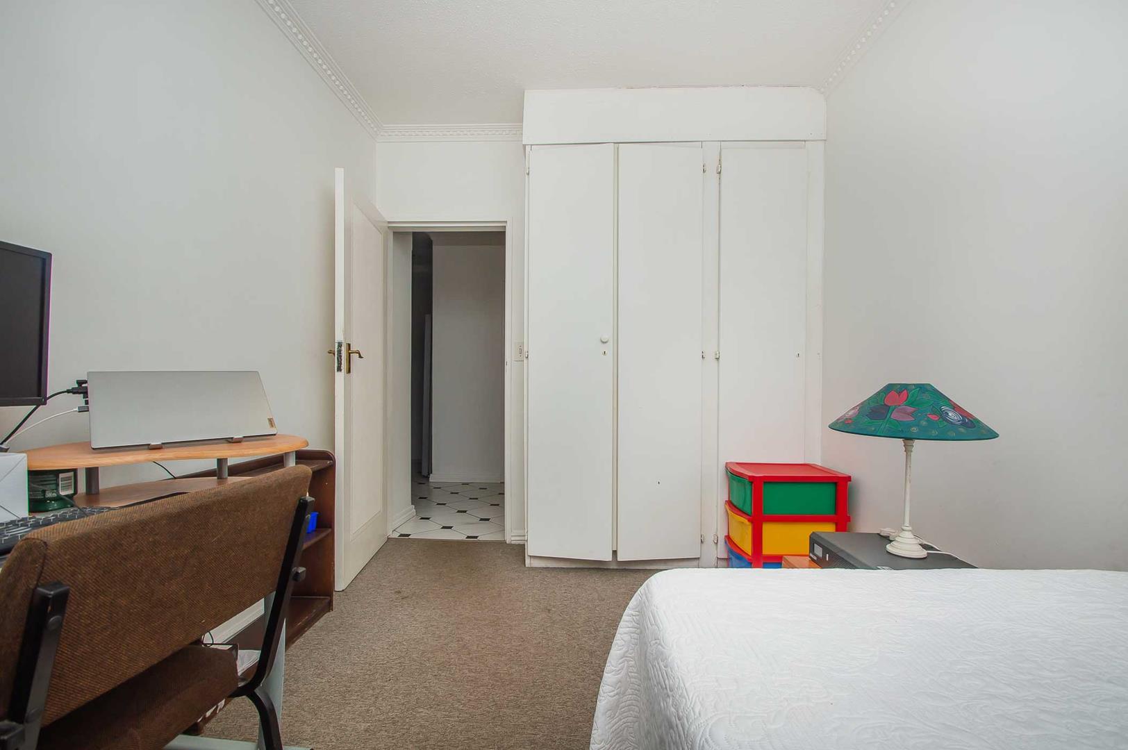 The second bedroom accommodates a queen-sized bed and study area, while the third is perfect for a workspace or children's room. A family bathroom with elegant floor-to-ceiling tiling and a bath complete this inviting home.
