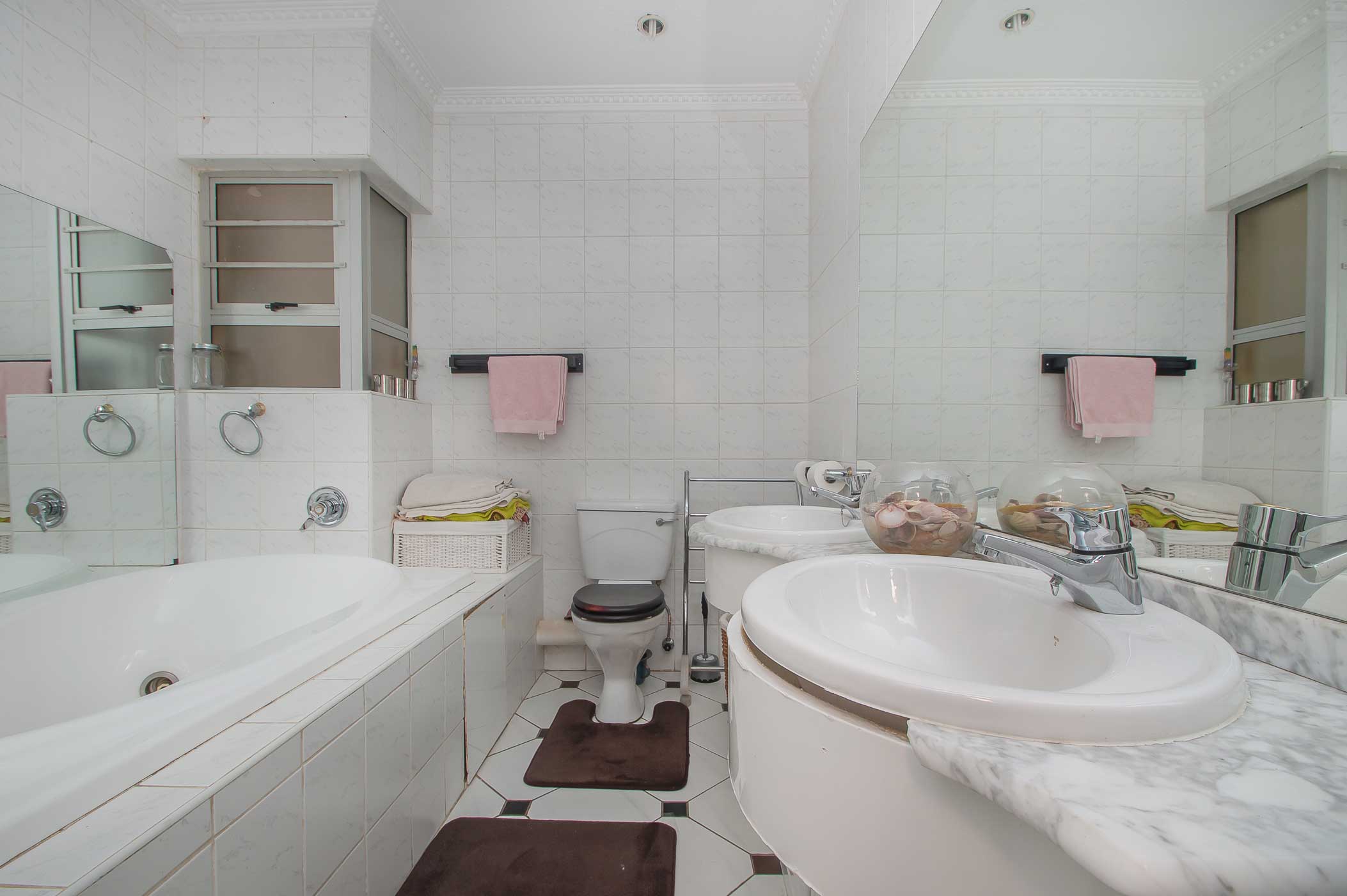 The thoughtfully positioned bedrooms ensure comfort and privacy. The expansive main bedroom includes an extra-large walk-in dressing room, with glass sliders that lead to the patio—perfect for morning coffee or evening relaxation. The en-suite bathroom features a corner bath and his and hers basins.