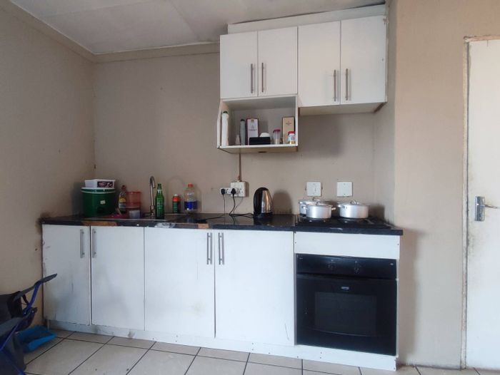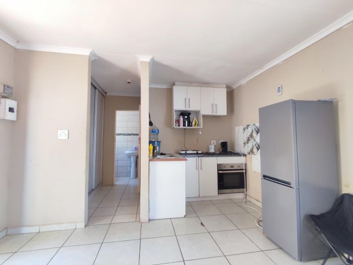 This stunning property boasts a modern kitchen complete with fitted cupboards, granite countertops, ample space for under-counter appliances, and a fitted stove. The open-plan lounge and dining area feature a sliding door that leads to the outdoor space, perfect for entertaining and enjoying the fresh air.