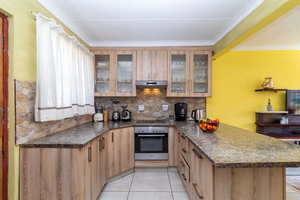 As you step inside the property, you will be welcomed by a warm and inviting living area that boasts plenty of natural light. The living room is spacious and airy, making it perfect for relaxing with family and friends. The well-appointed kitchen is equipped with a fitted stove and hob, a granite top, space for an under-counter appliance, a breakfast nook, and ample cupboard space, making cooking and entertaining a breeze.
