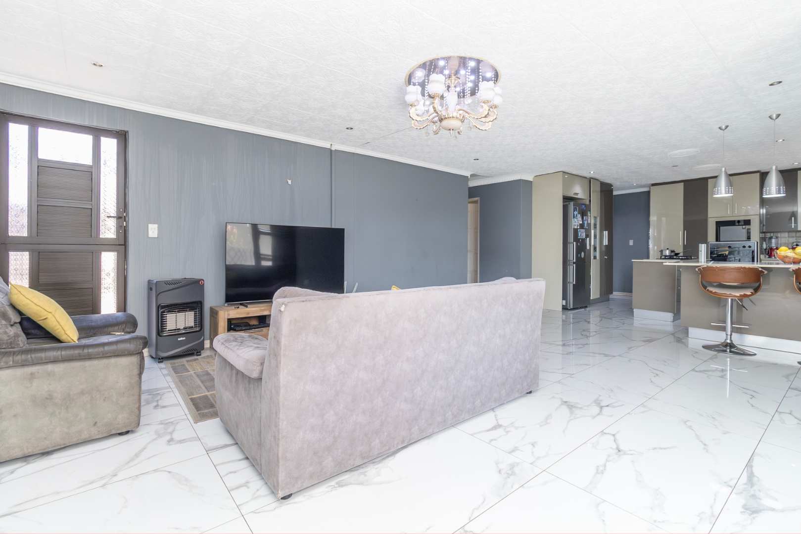 The open-plan dining and lounge area provides a welcoming space to relax and entertain guests. With its seamless flow and a sliding door opening to the outdoors, this area is perfect for hosting gatherings or enjoying quiet family evenings.
