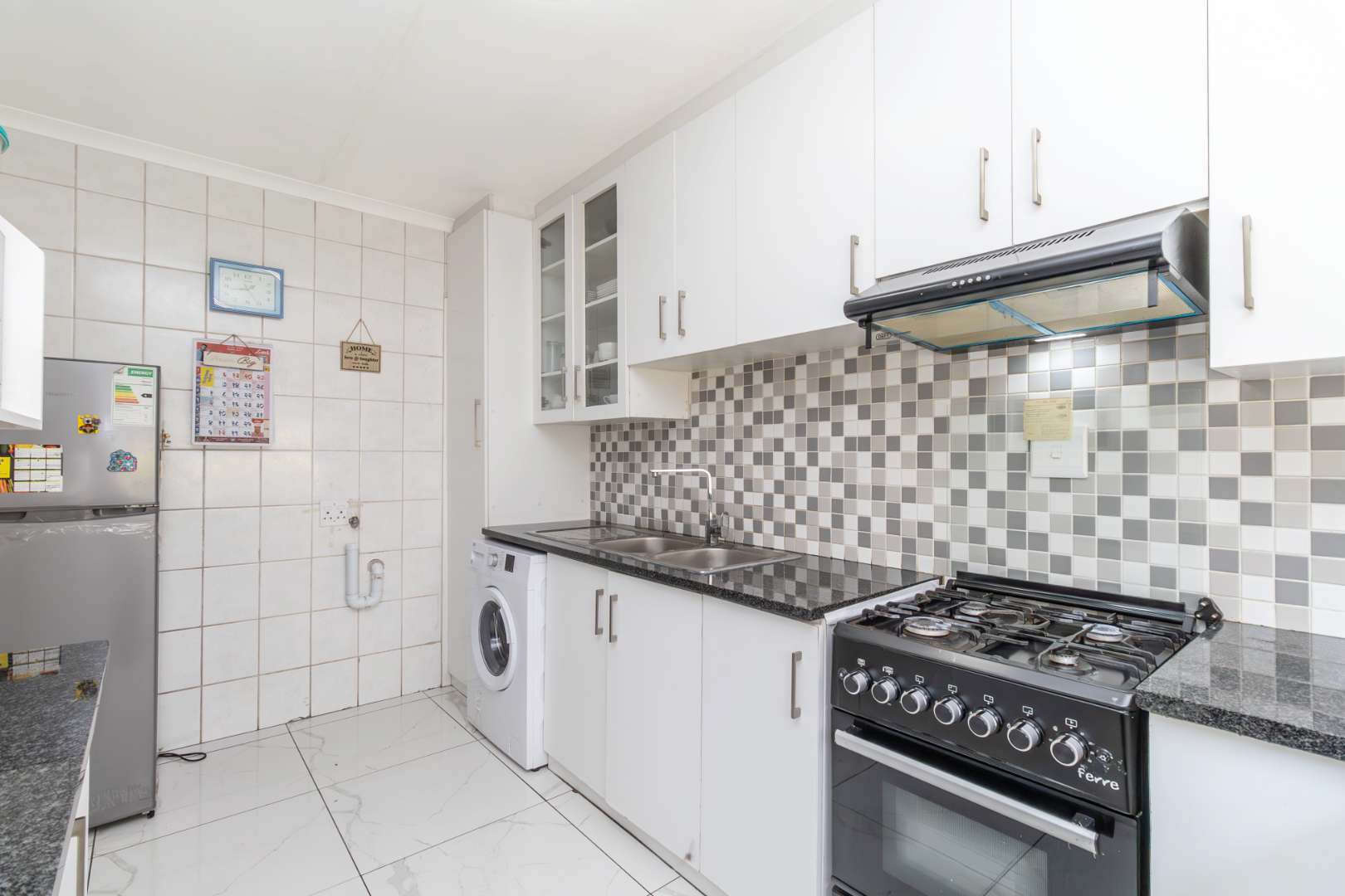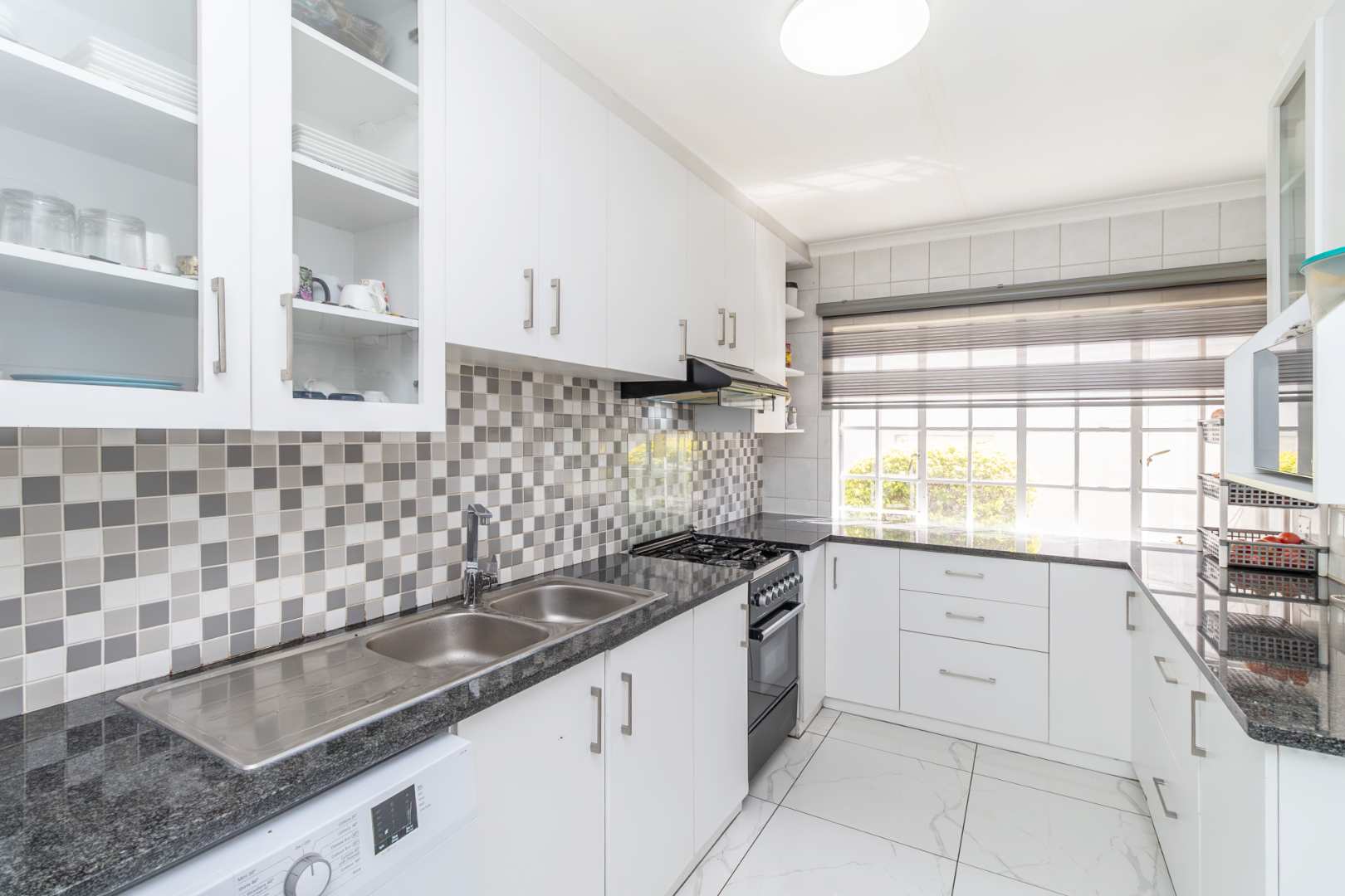 The kitchen is thoughtfully designed to cater to all your culinary needs. It features ample cupboard space, sleek granite countertops, and modern window blinds, making it both functional and stylish.