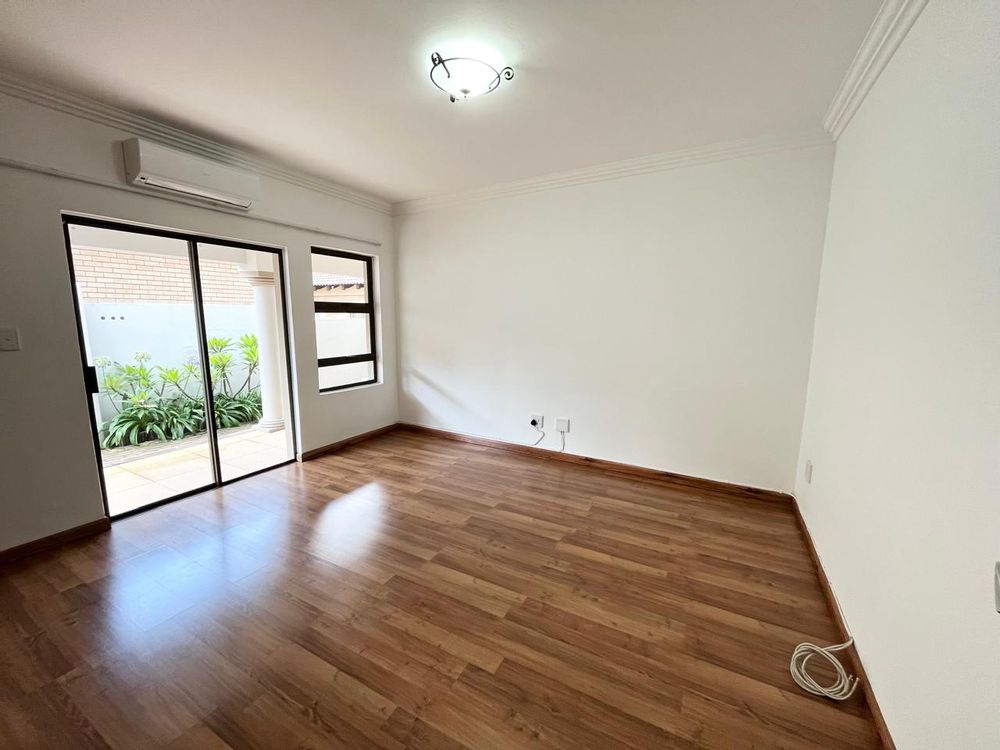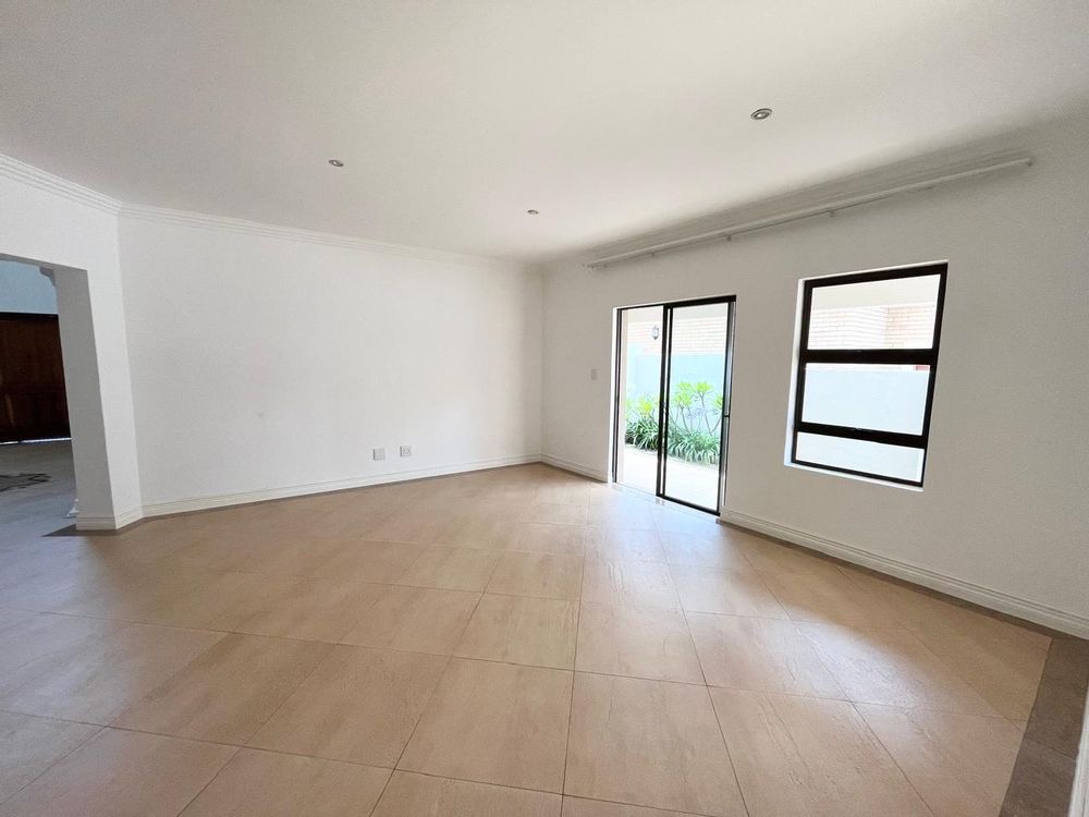 Adjacent to the kitchen is the dining room, which opens onto a patio featuring a built-in braai. This outdoor space overlooks a beautifully manicured garden, offering a picturesque backdrop for gatherings and family activities.