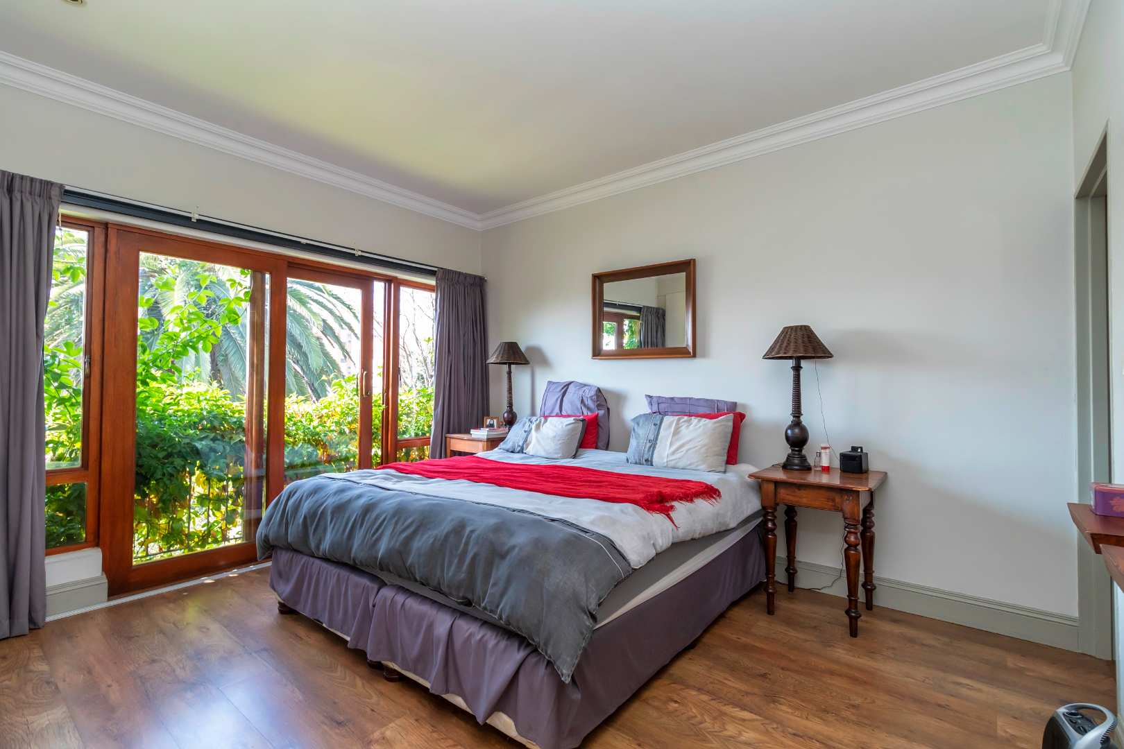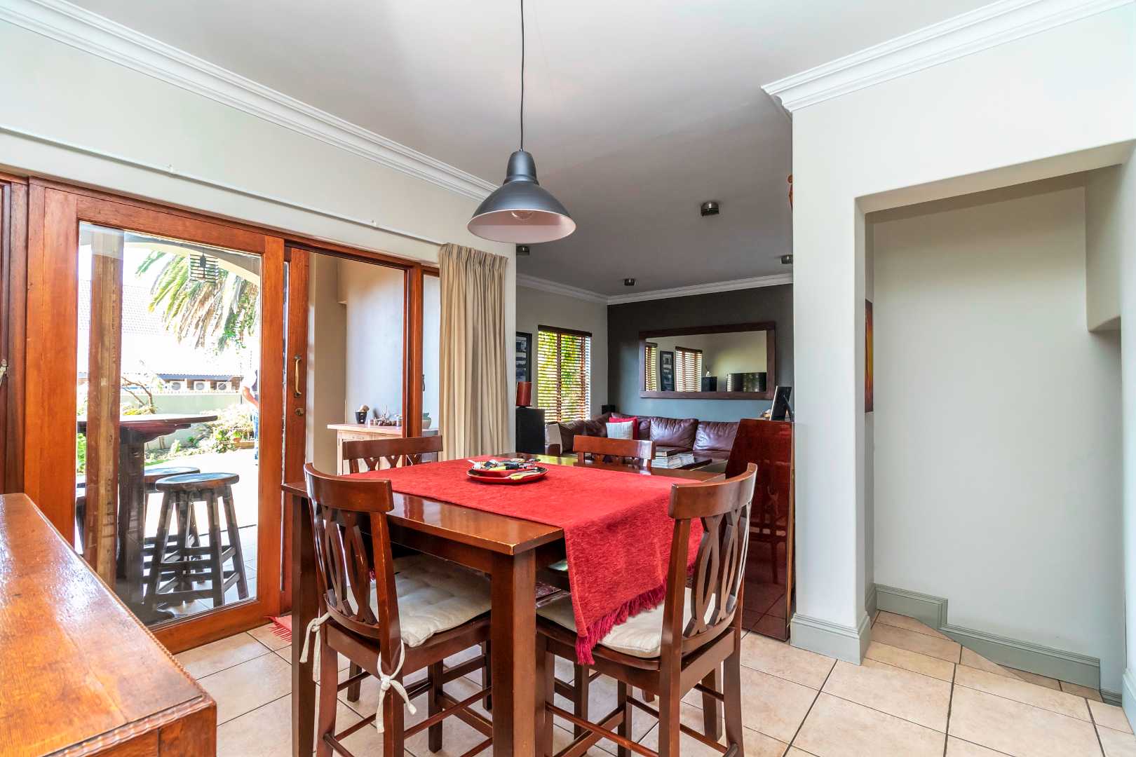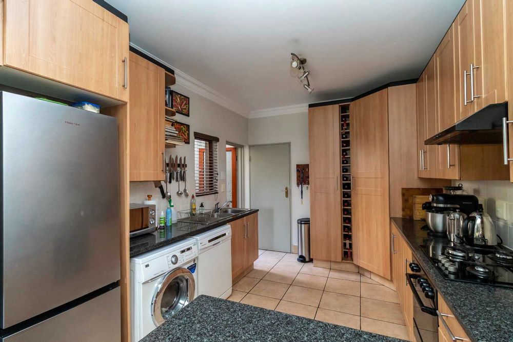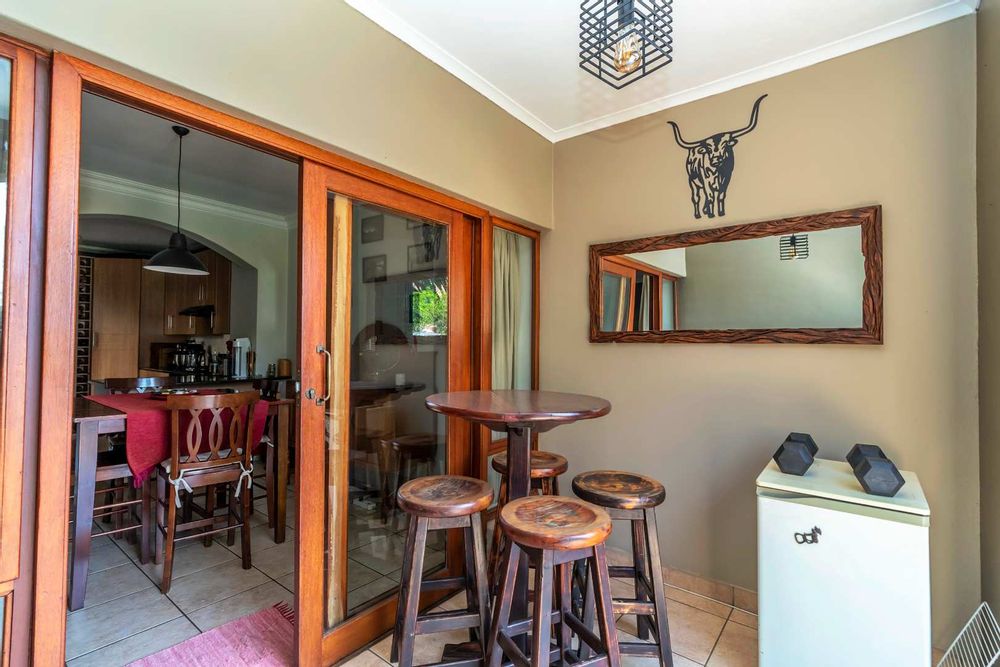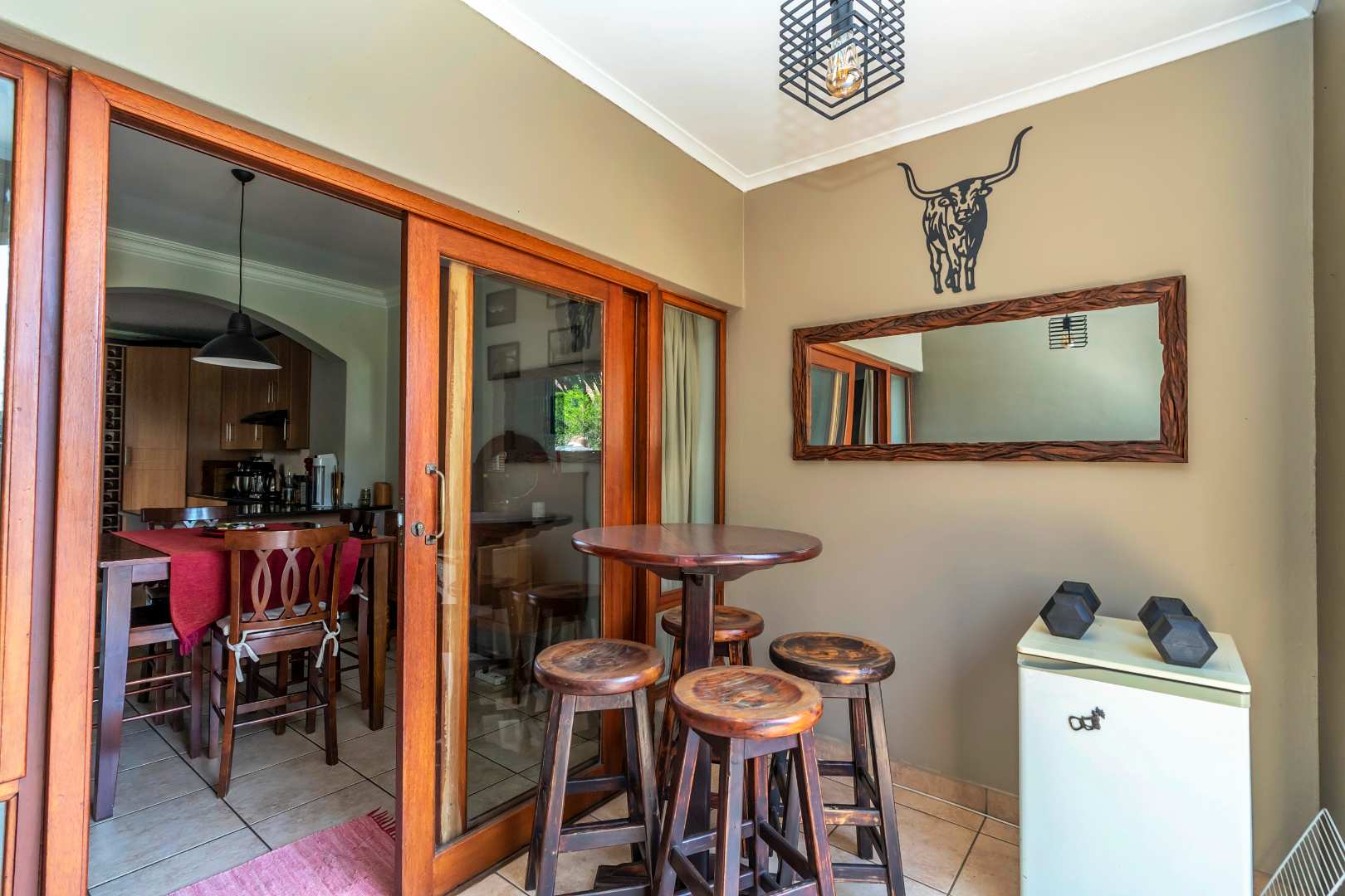 The fully tiled, spacious open plan lounge and dining areas seamlessly flow onto the semi covered patio and beautifully manicured private garden. Leading off the patio is a built-in braai surrounded by wooden decking creating a vibrant ambiance.