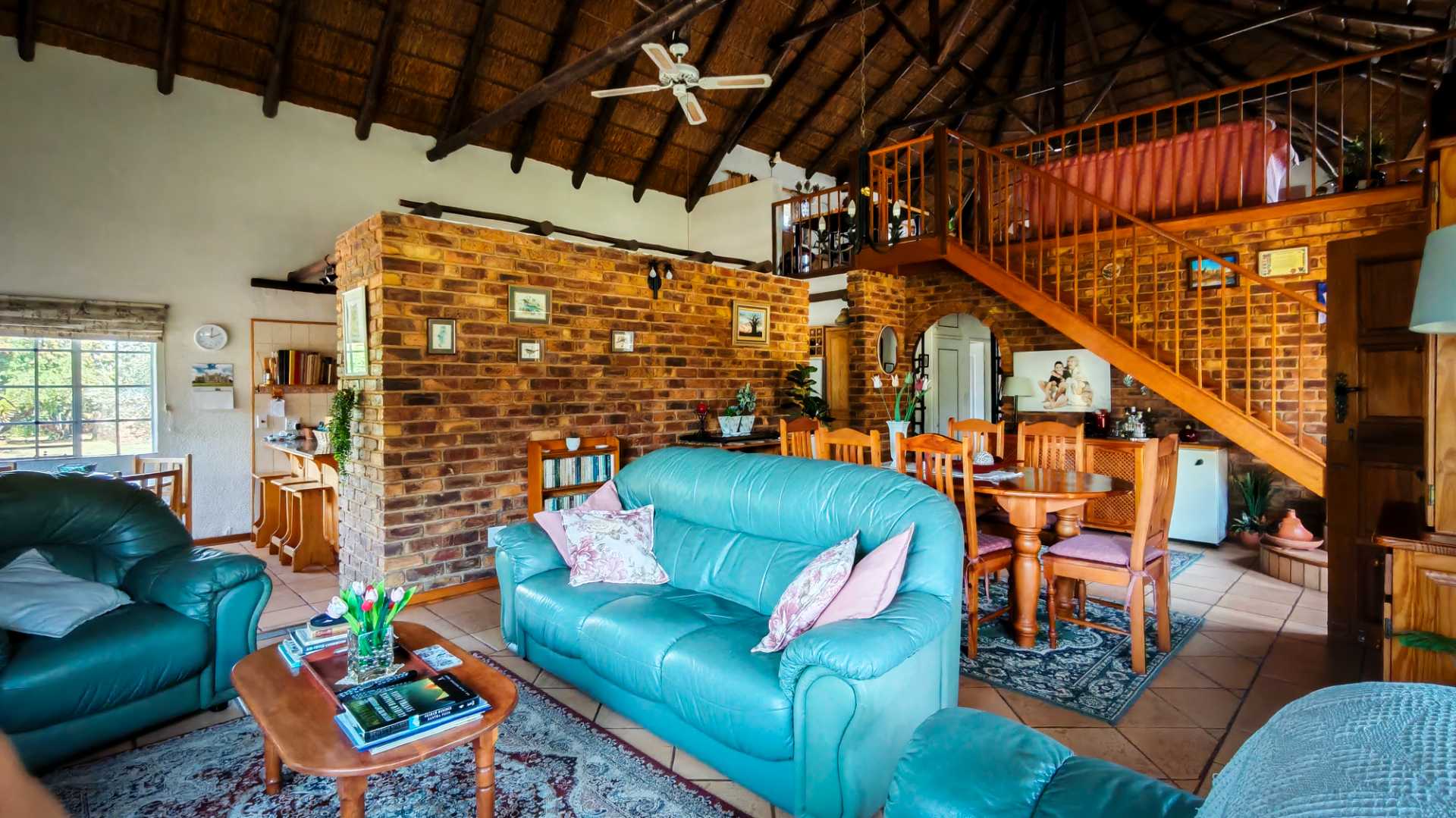 The main house features three bedrooms and two full bathrooms. A specially designed security gate provides an extra layer of security in this area. The main bedroom includes a dressing room and peaceful views over the garden. The spacious lounge has a lovely bay window, exposed thatch and beam ceilings and a built-in heater.