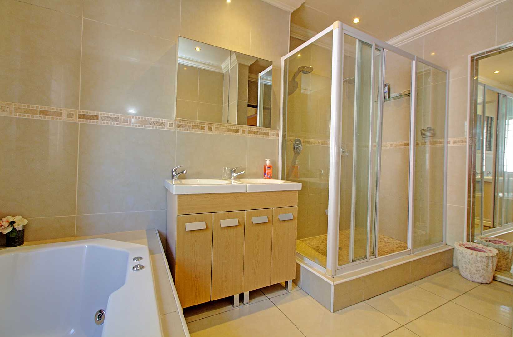 From the living areas, you move out to a beautifully designed patio with glass stack doors, revealing a built-in braai and an inviting outdoor entertainment space. Overlooking a lush garden and sparkling pool, it’s the perfect setting for weekend braais, gatherings, or quiet afternoons at home.