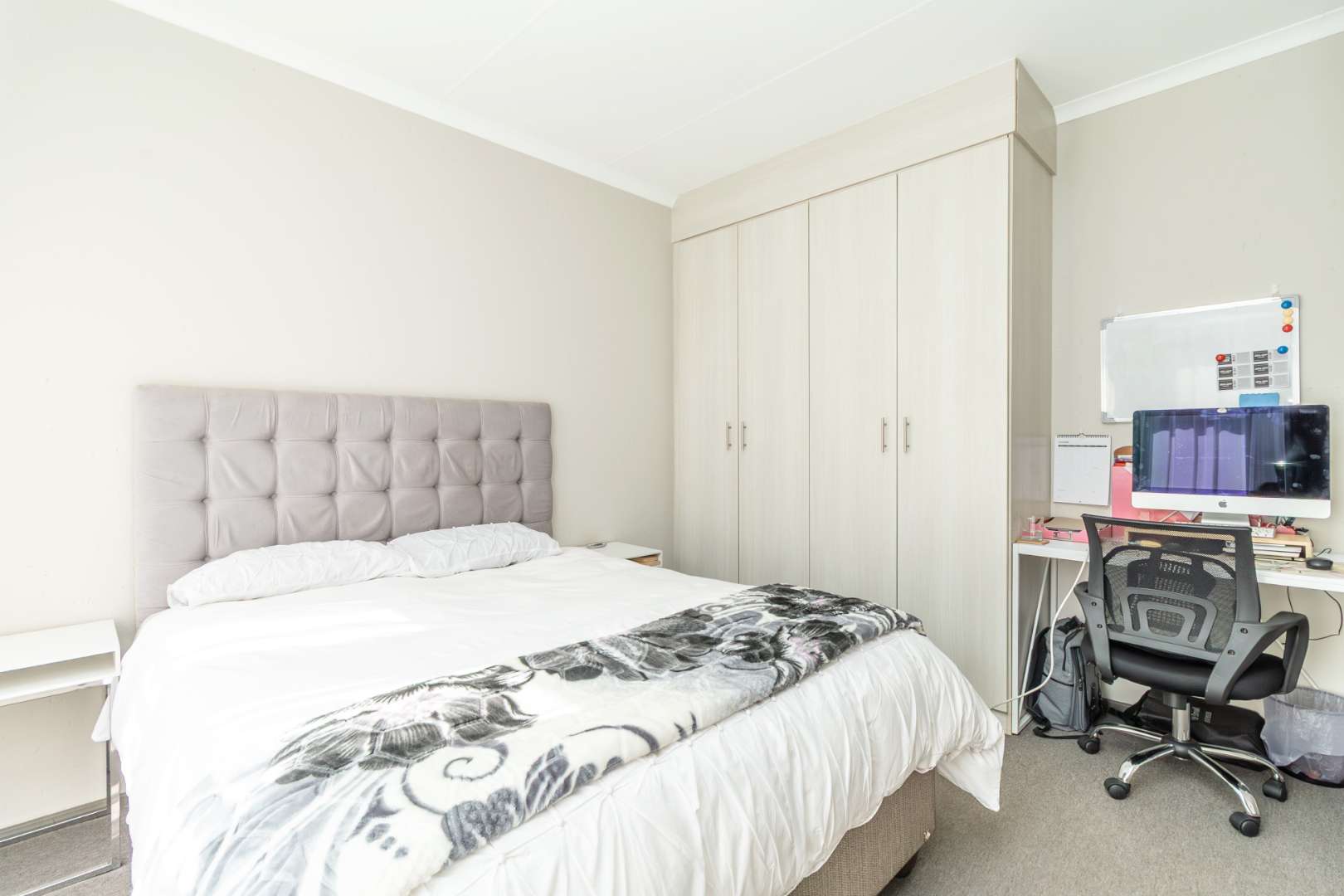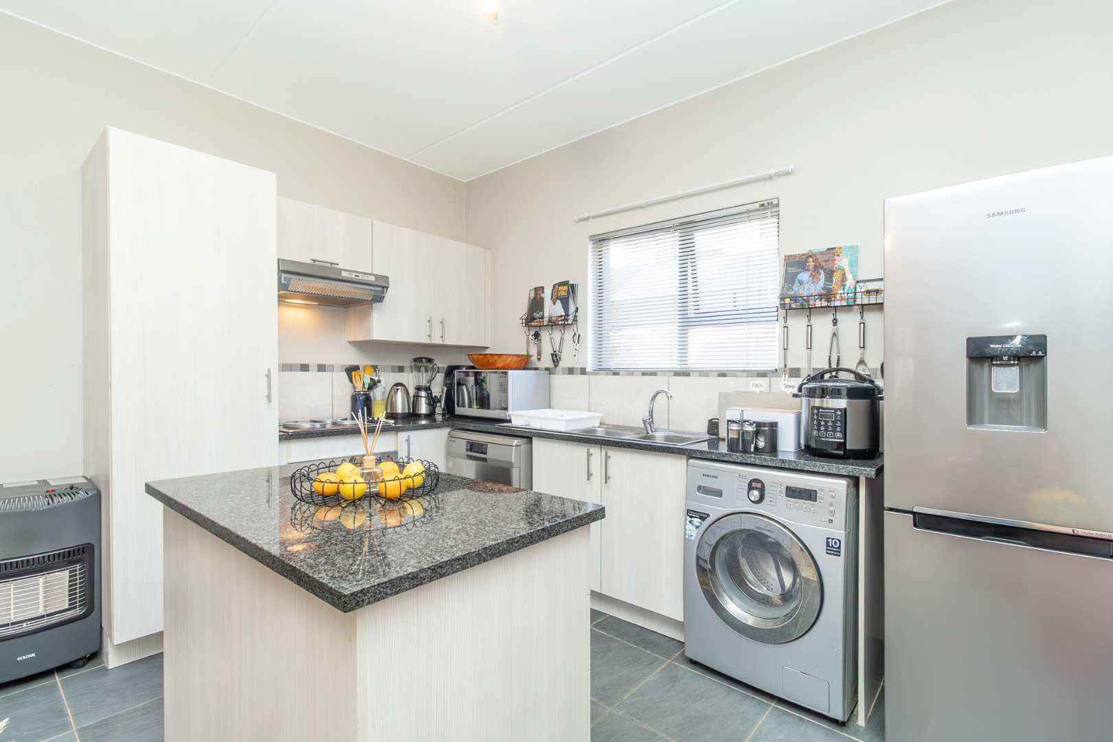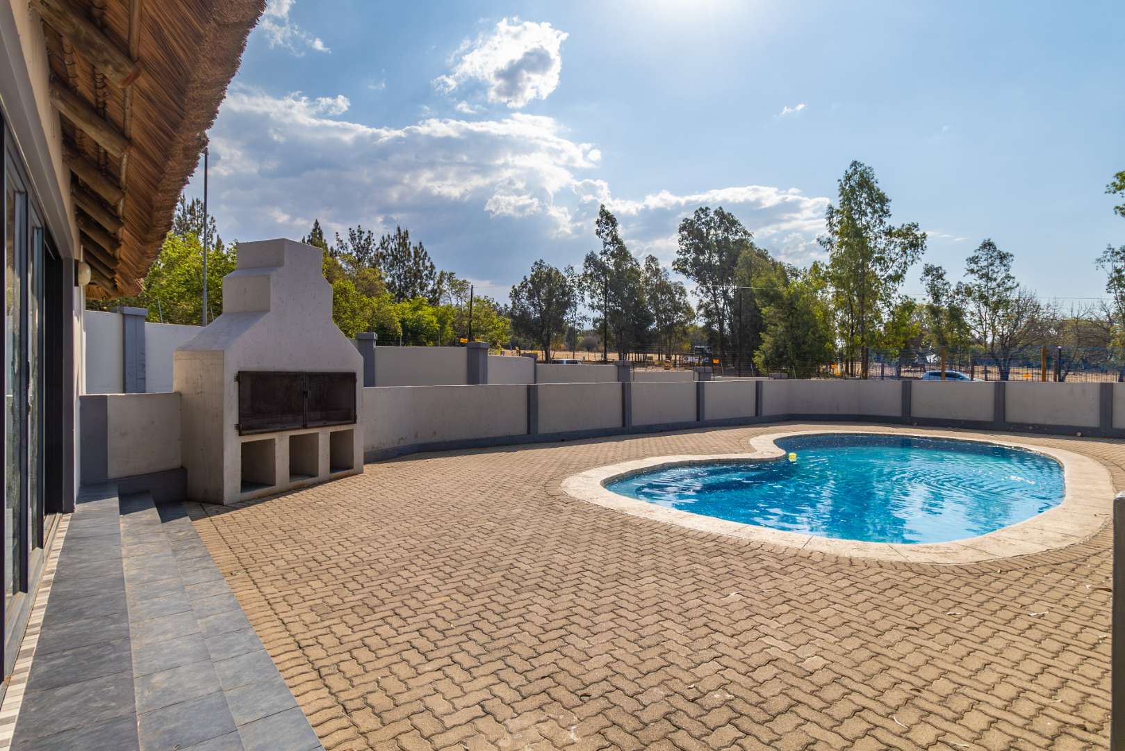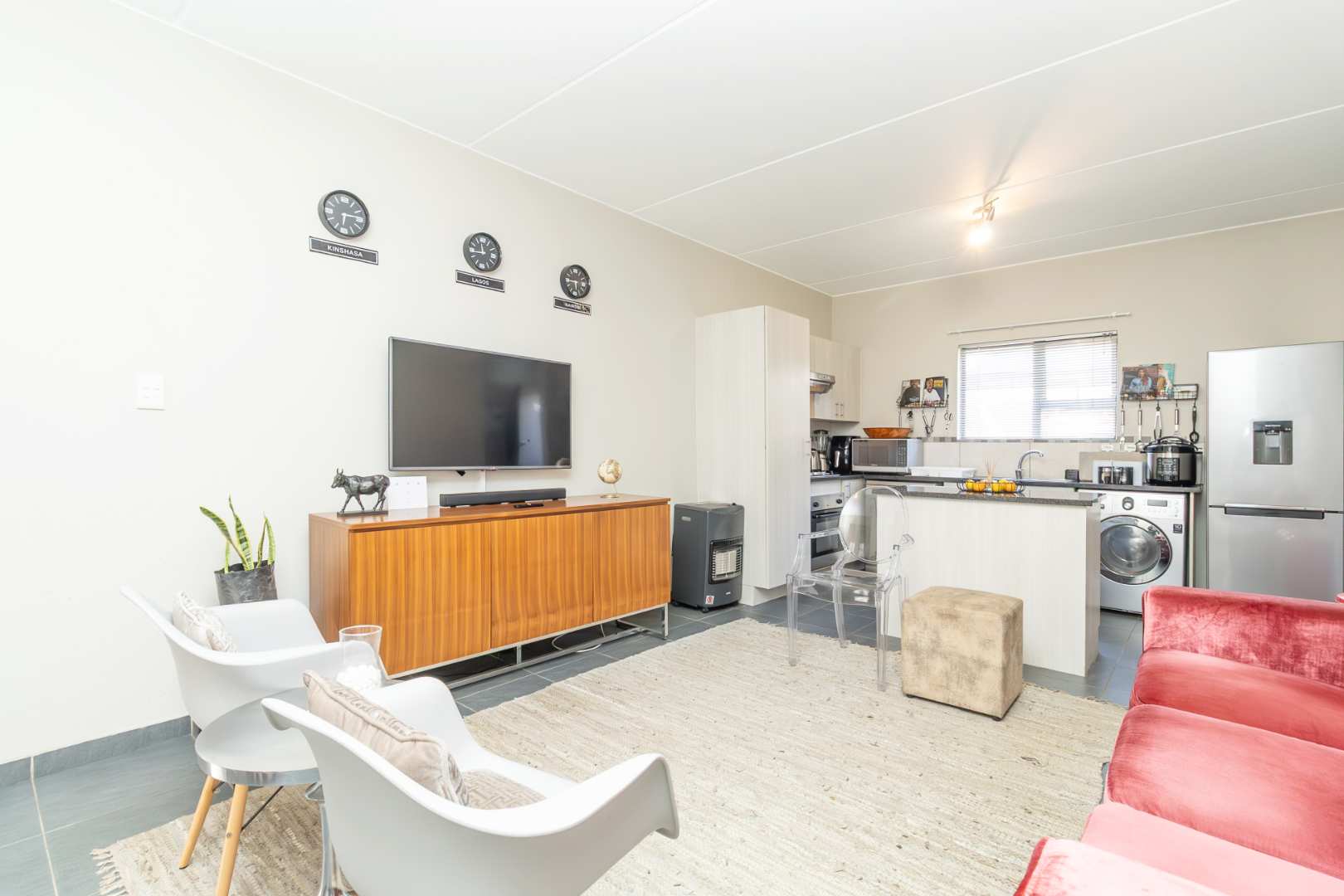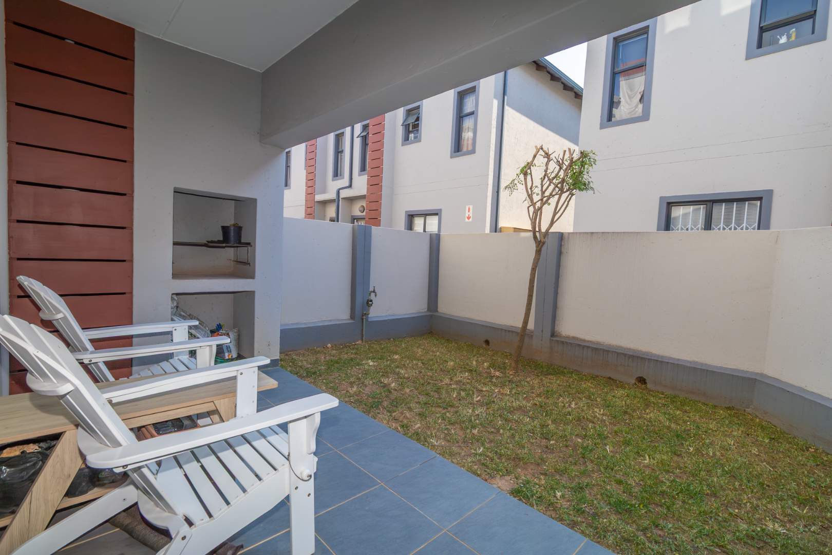 Step inside to discover an inviting open-plan lounge, complete with a glass slider that seamlessly extends your living space to a covered patio. Here, you'll find a built-in braai, and a quaint garden that is not suitable for pets.