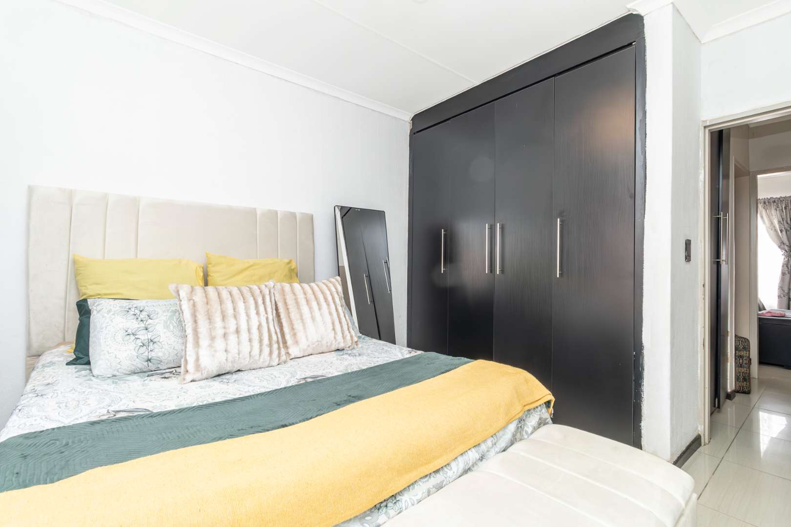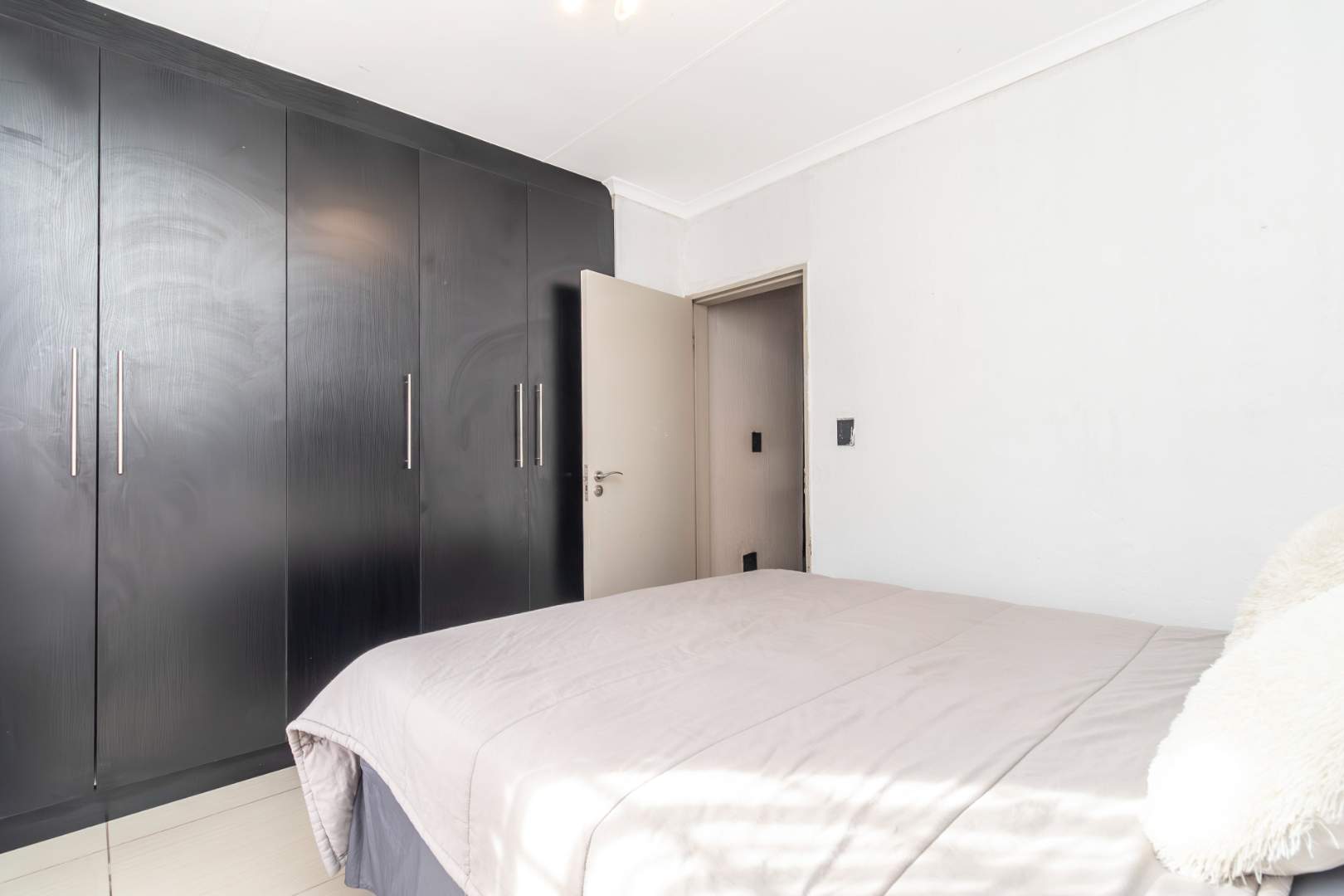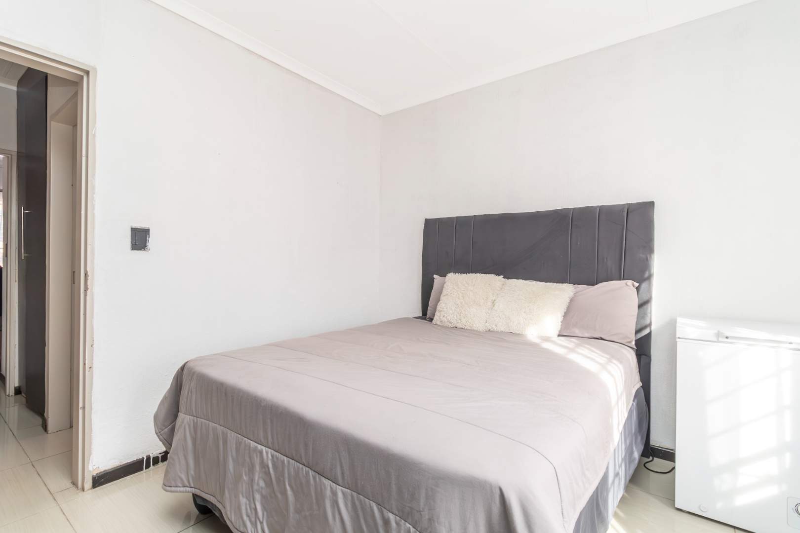 The modern kitchen is both neat and functional, offering ample cupboard space, and the garage accommodates more appliances. Both bedrooms are spacious, featuring built-in cupboards that easily accommodate king- and queen-size beds. A convenient linen cupboard in the passage adds to the ample storage options. The property also includes a well-maintained modern bathroom.
