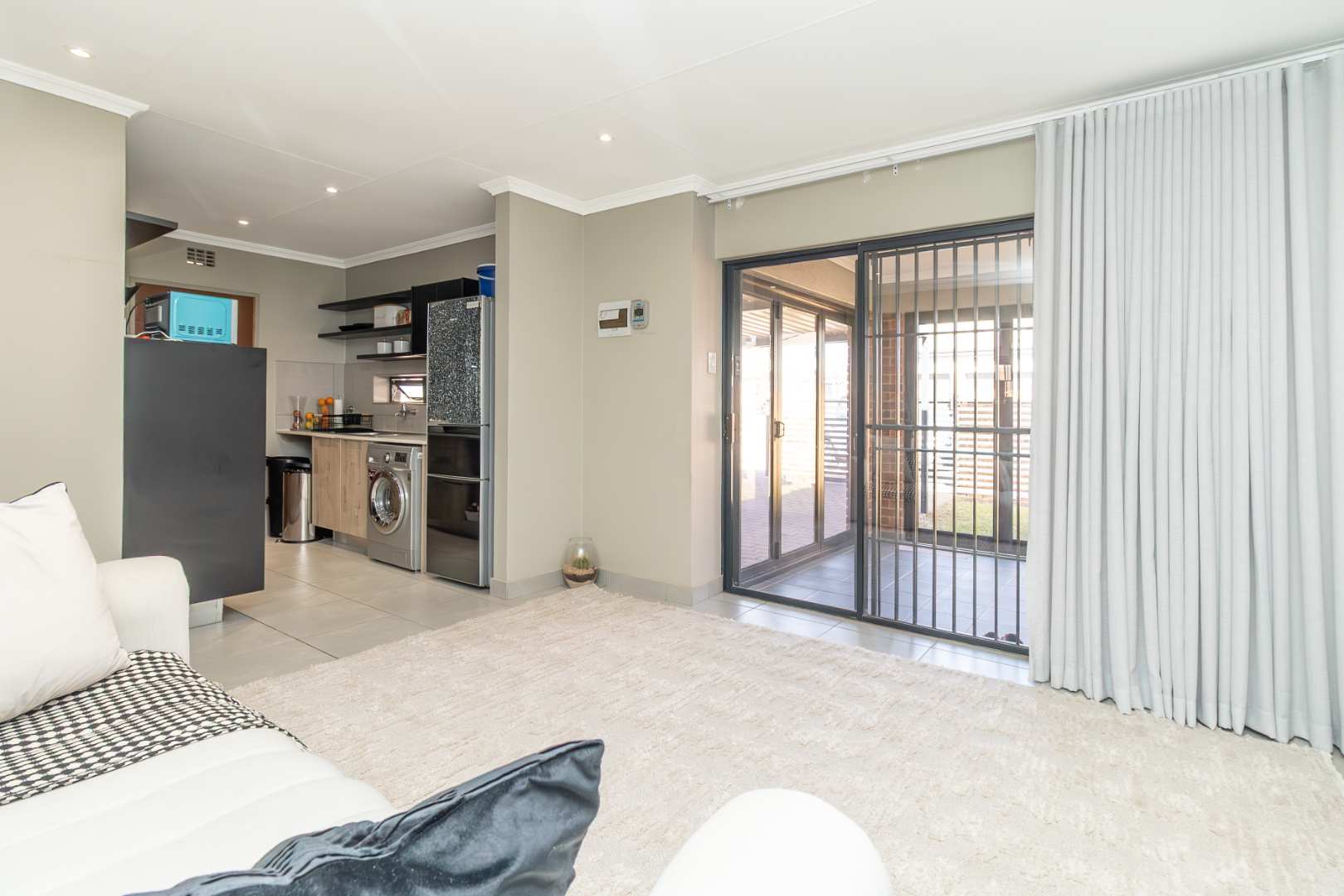 Entertainer's dream in a quiet Boskruin cul-de-sac, Randburg — covered patio with built-in gas braai overlooks a private garden for relaxed gatherings; two bedrooms, two bathrooms, tandem carport.