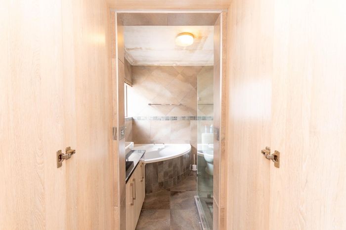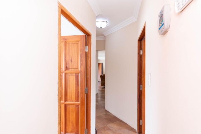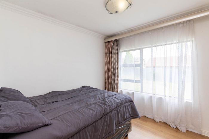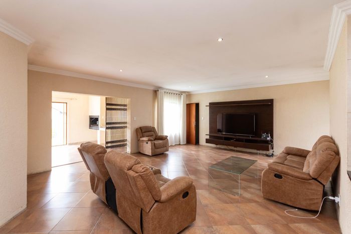 Active family life in an access-controlled estate with clubhouse and sports fields. Enclosed patio with built-in braai overlooks private pet-friendly garden; 3 beds, 2 baths, double garage.
