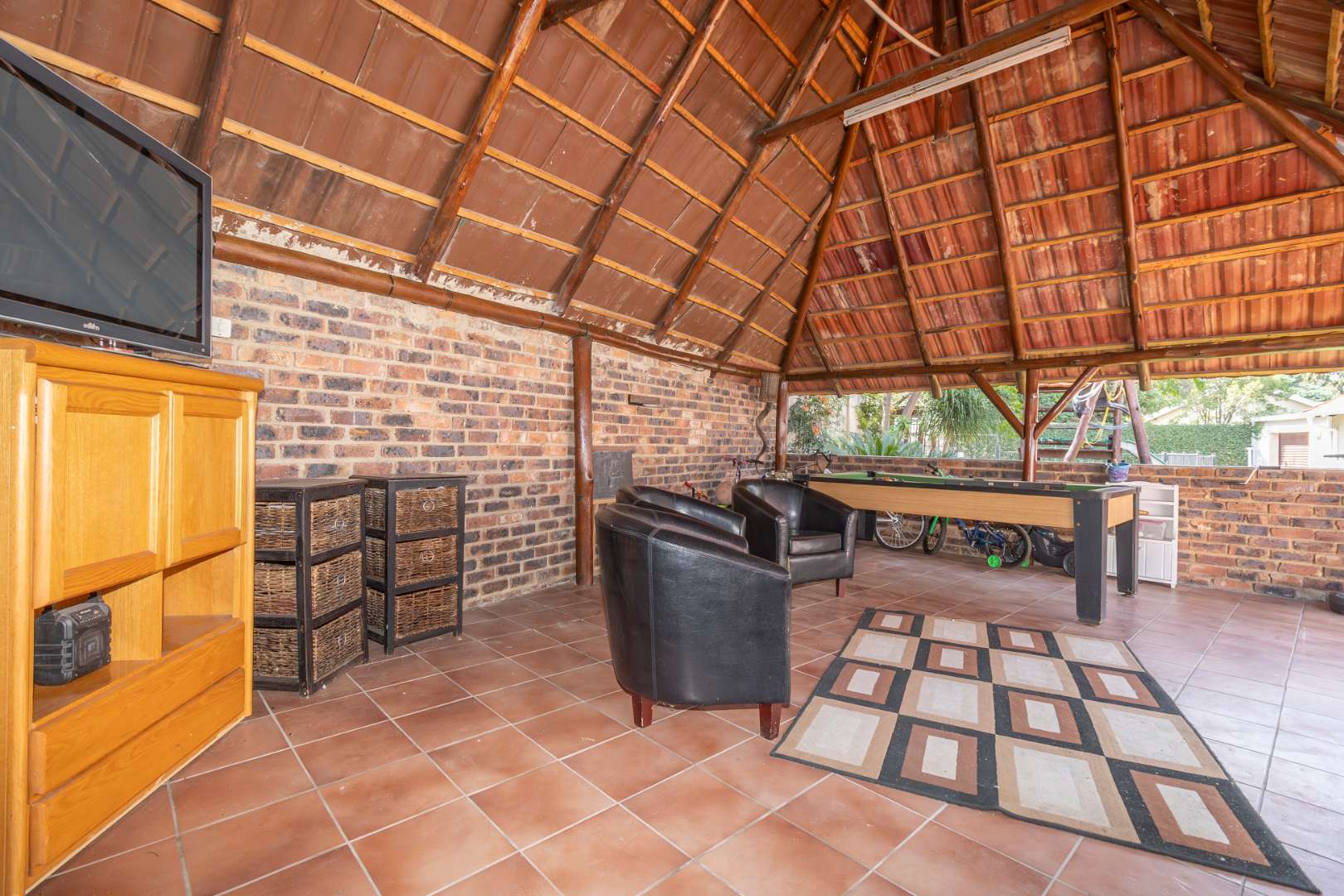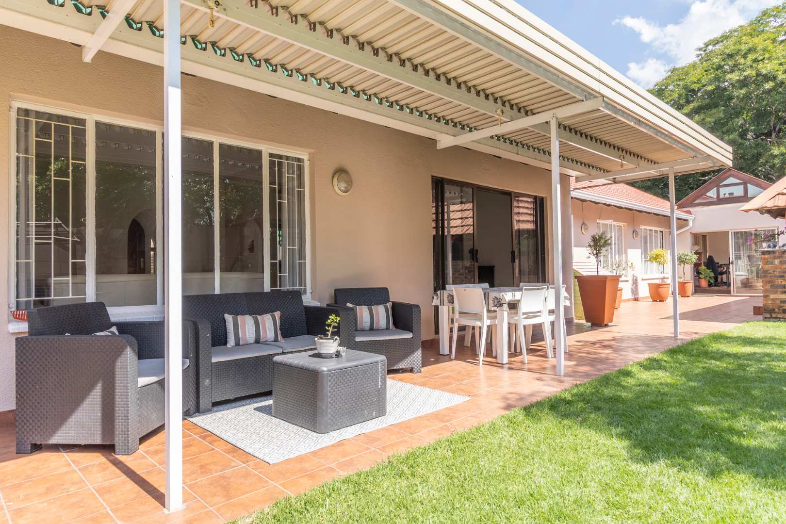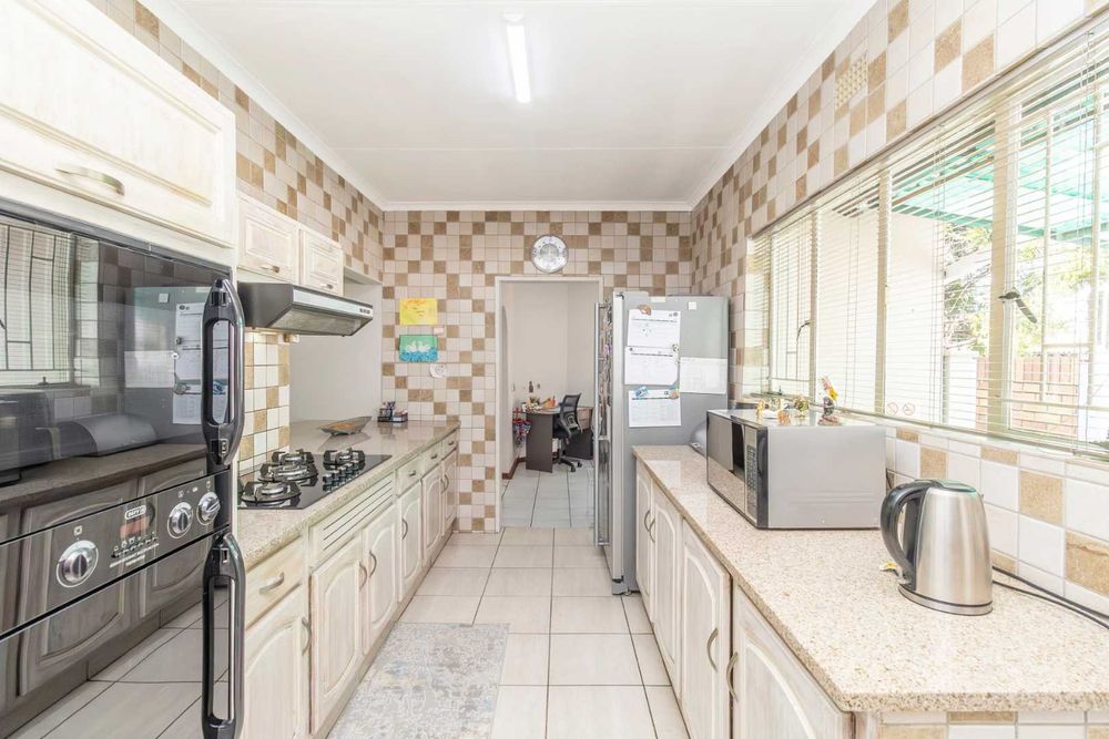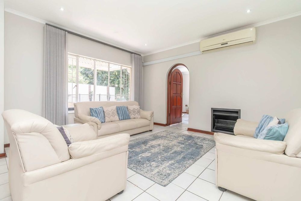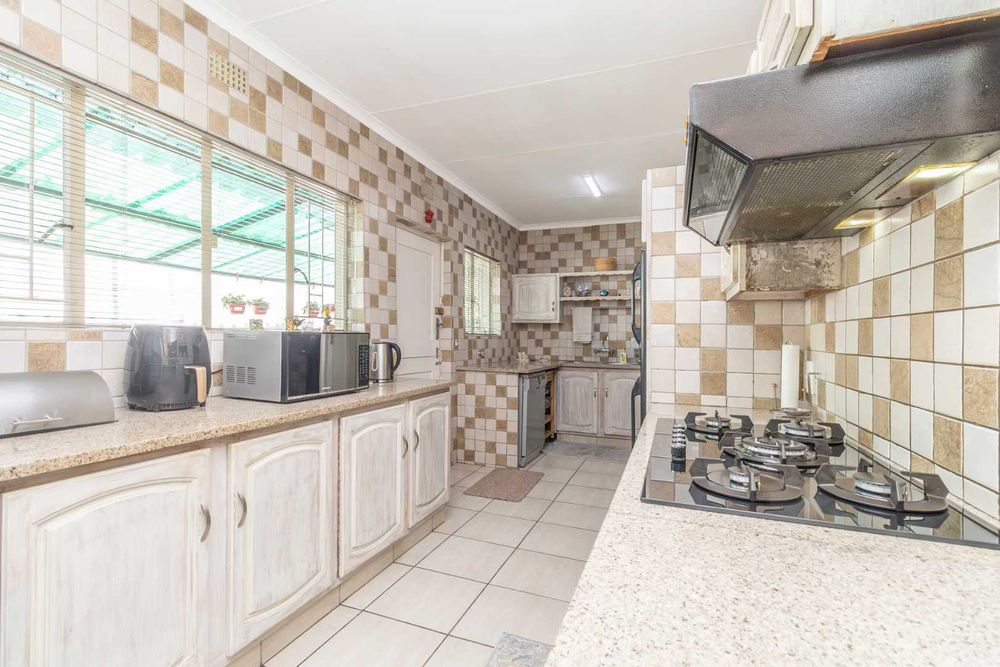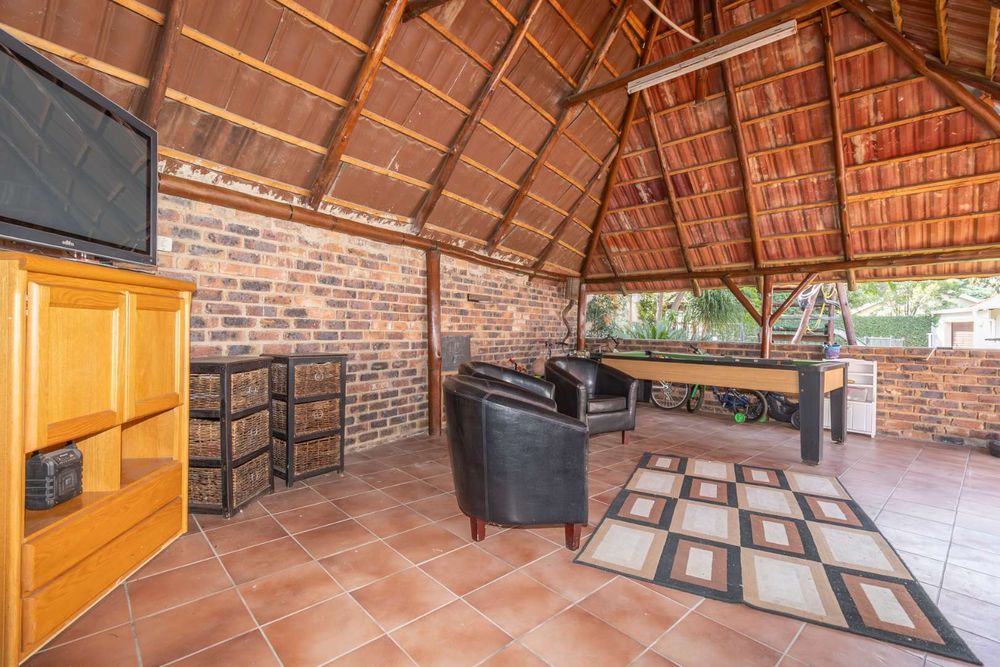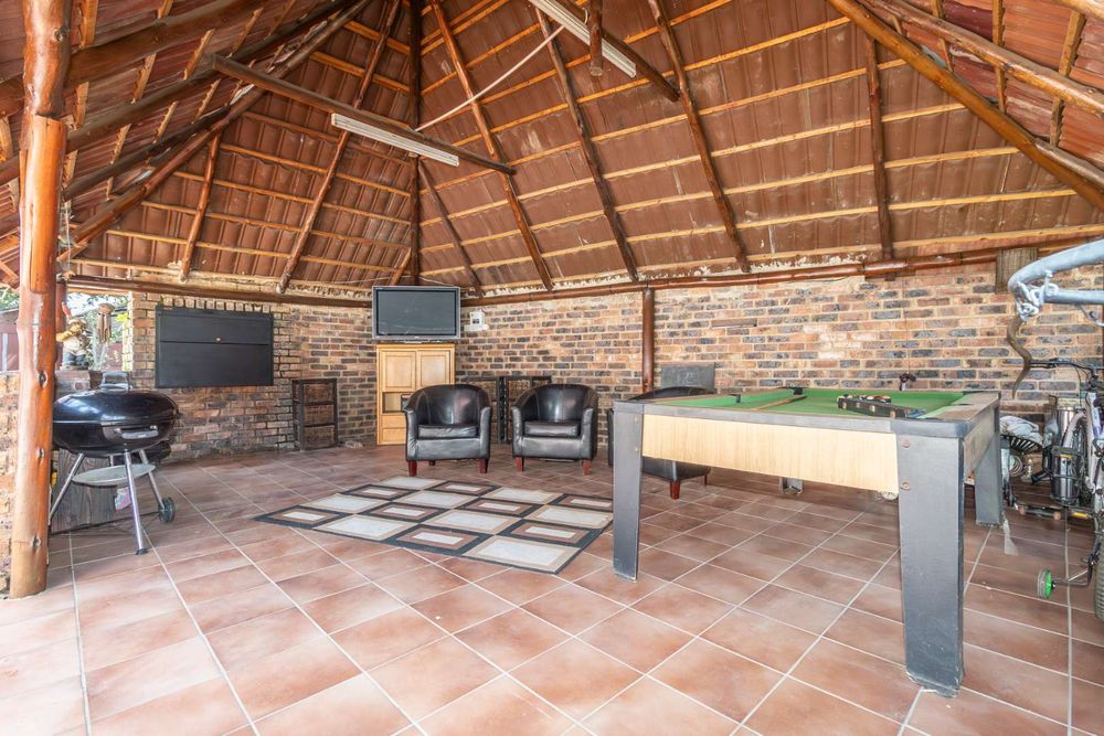 Step outside to discover a beautifully landscaped garden, complete with mature trees, vibrant plants, and lush grass. The garden's centerpiece is a delightful lapa, ideal for both summer and winter gatherings. A sparkling pool is a must-have for those hot summer days, and there are lovely seating areas throughout the garden where you can unwind and listen to the soothing sounds of nature. Bird lovers will appreciate the on-site aviary.