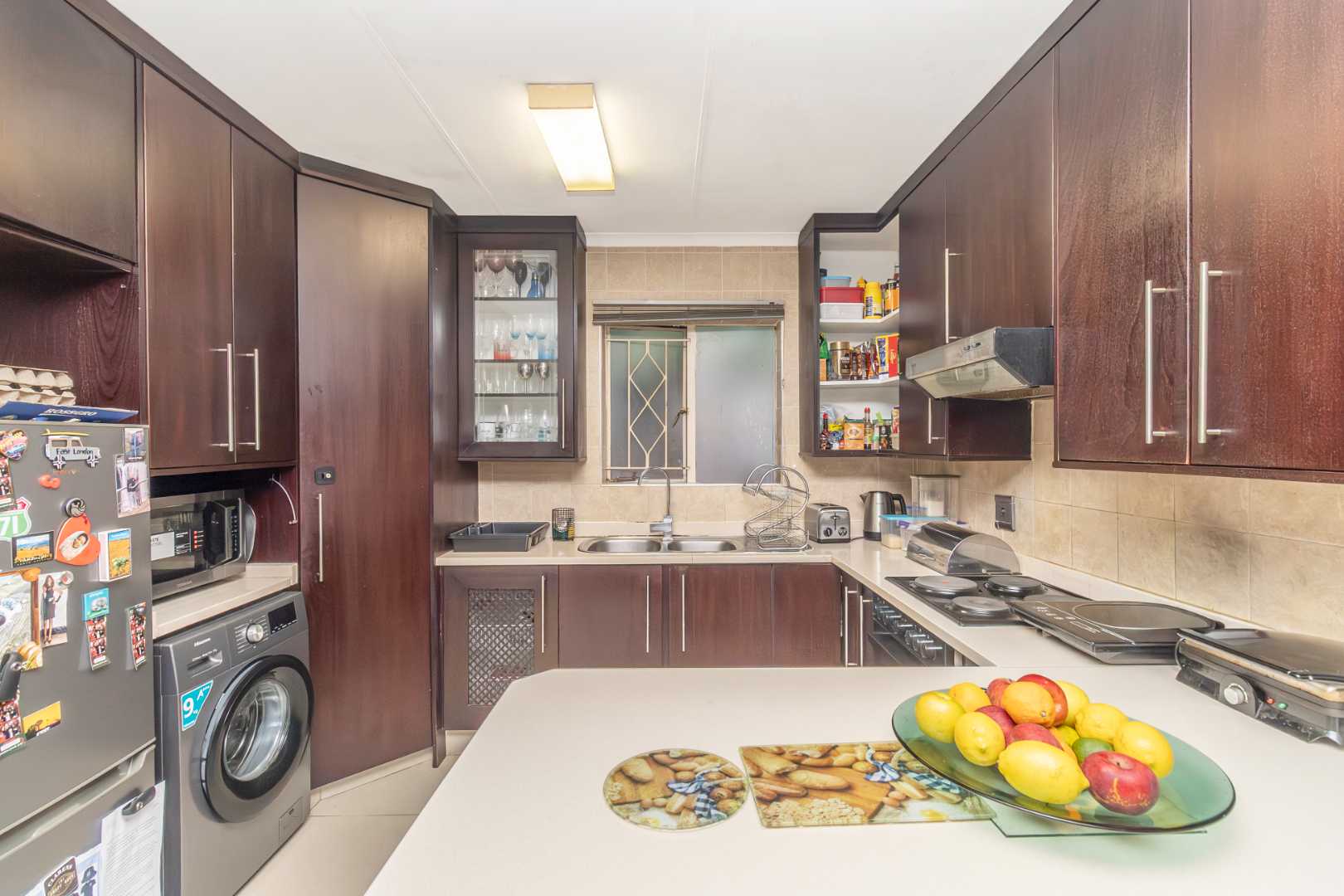The modern kitchen is well-designed with good flow and functionality, making everyday living simple and efficient.