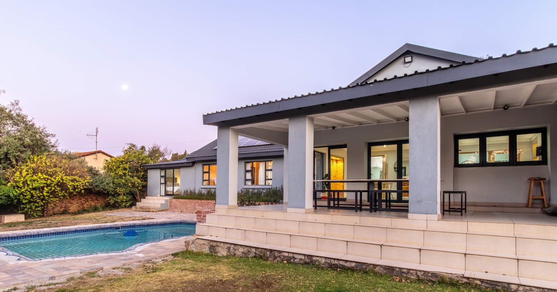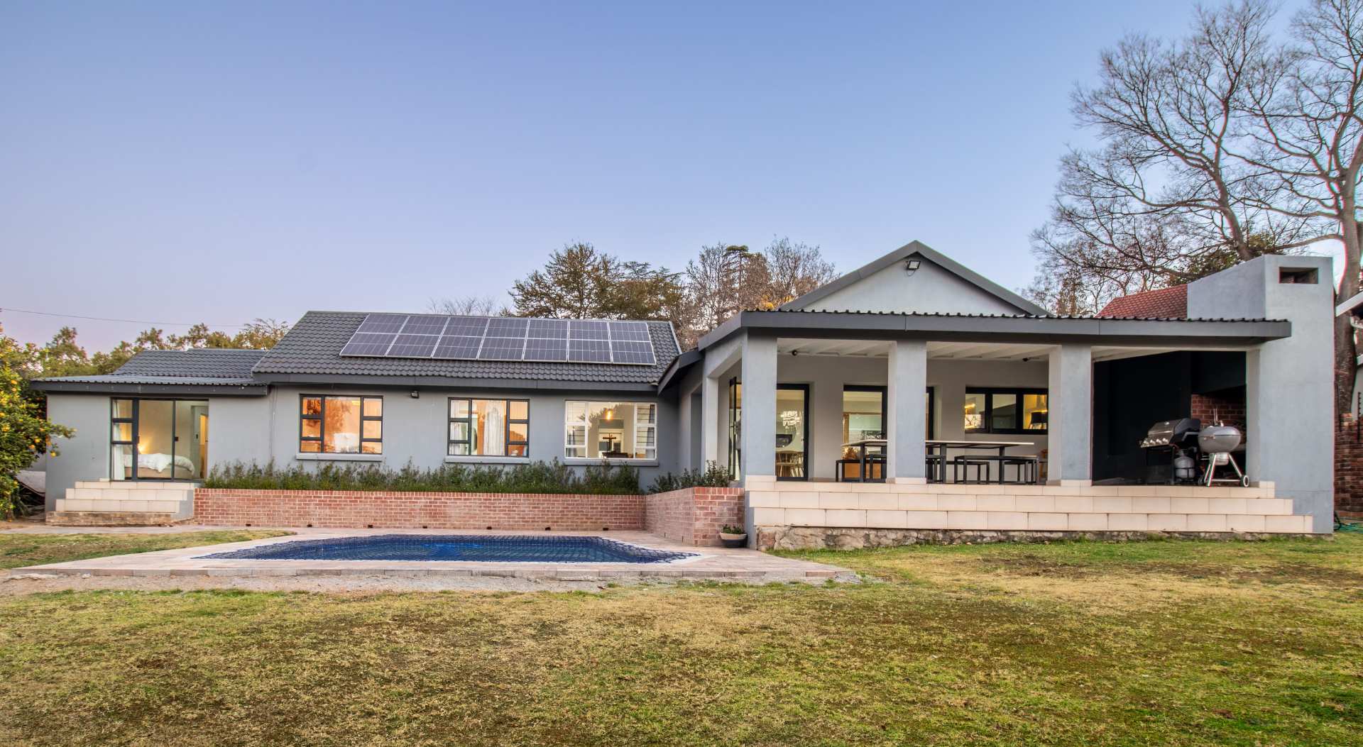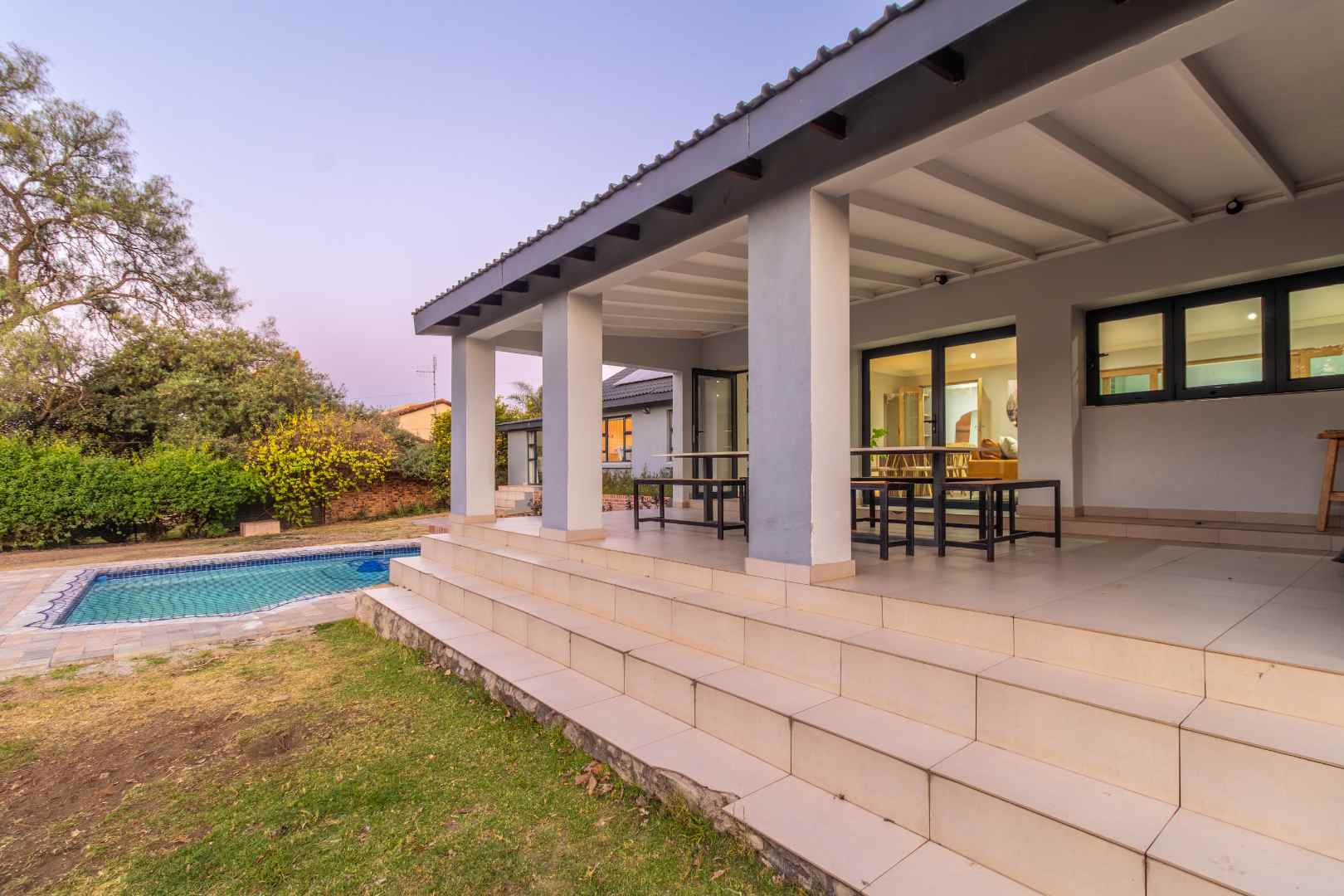 Outside is a large garden with pool. The perfect entertainment area and backyard to enjoy our South-African weather!