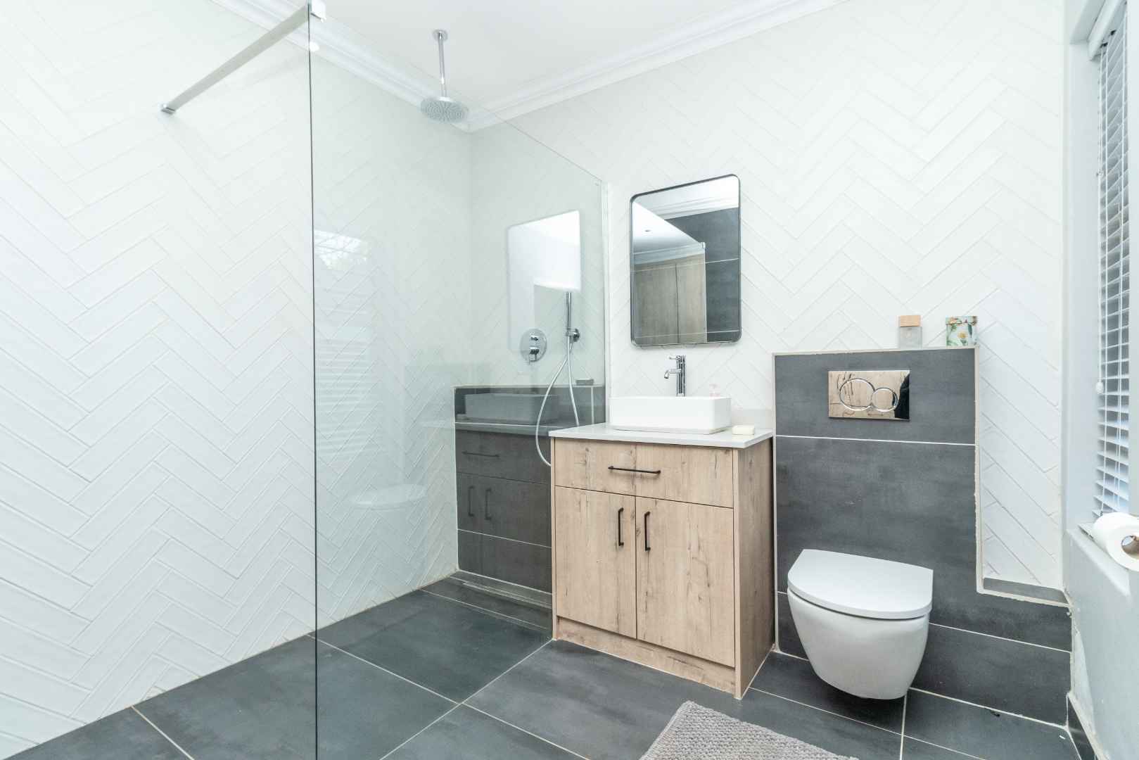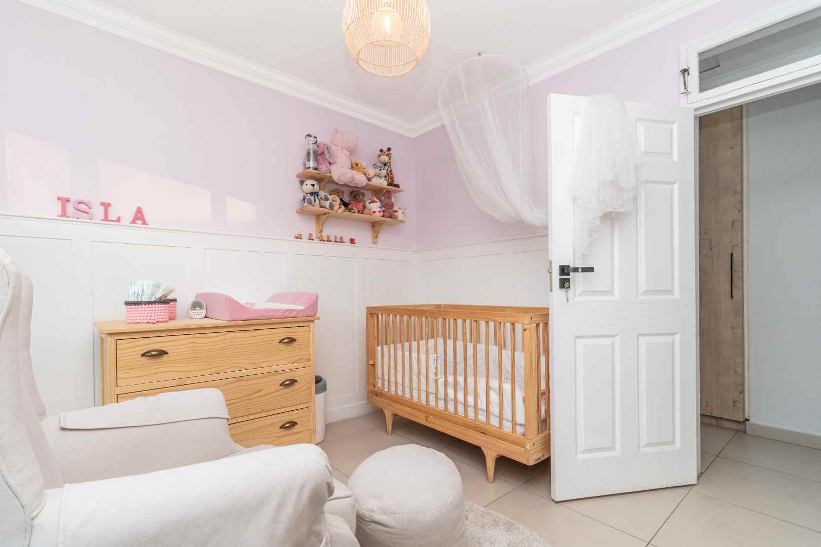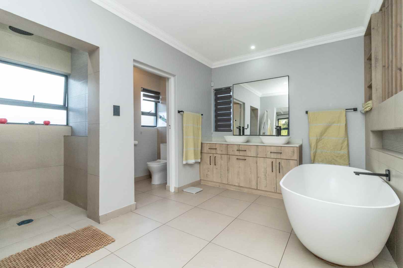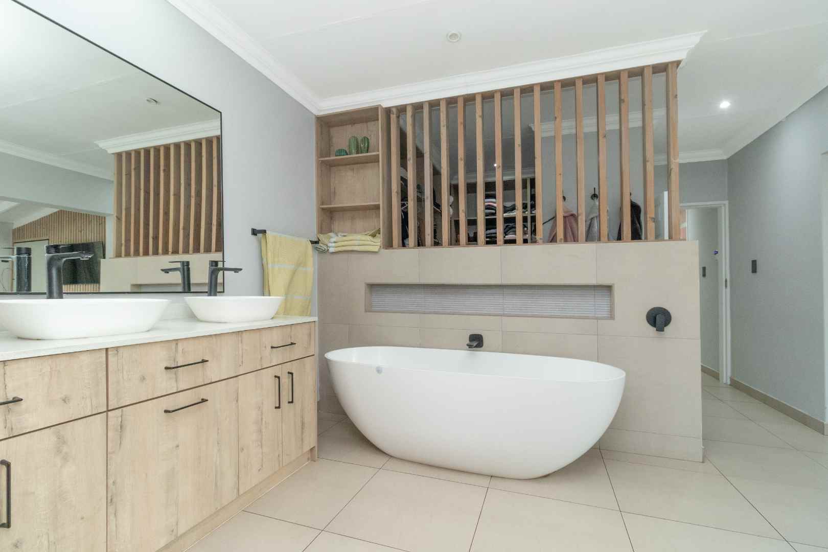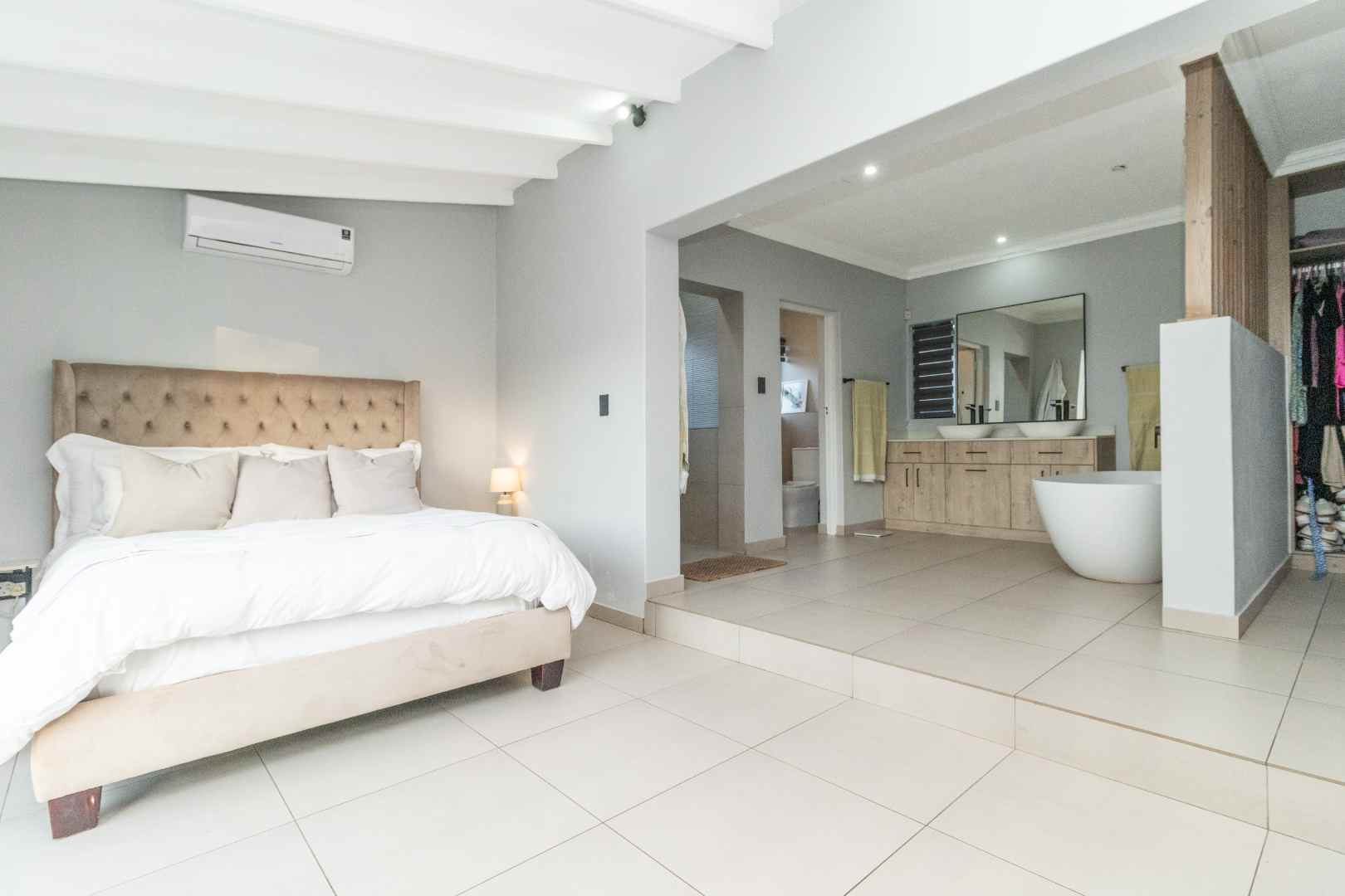 When you turn to the right from the front door you get the study and 4 Bedrooms. The main bedroom has an open plan en-suite bathroom. Bathroom has a bath and shower with separate space for large walk-in cupboards.