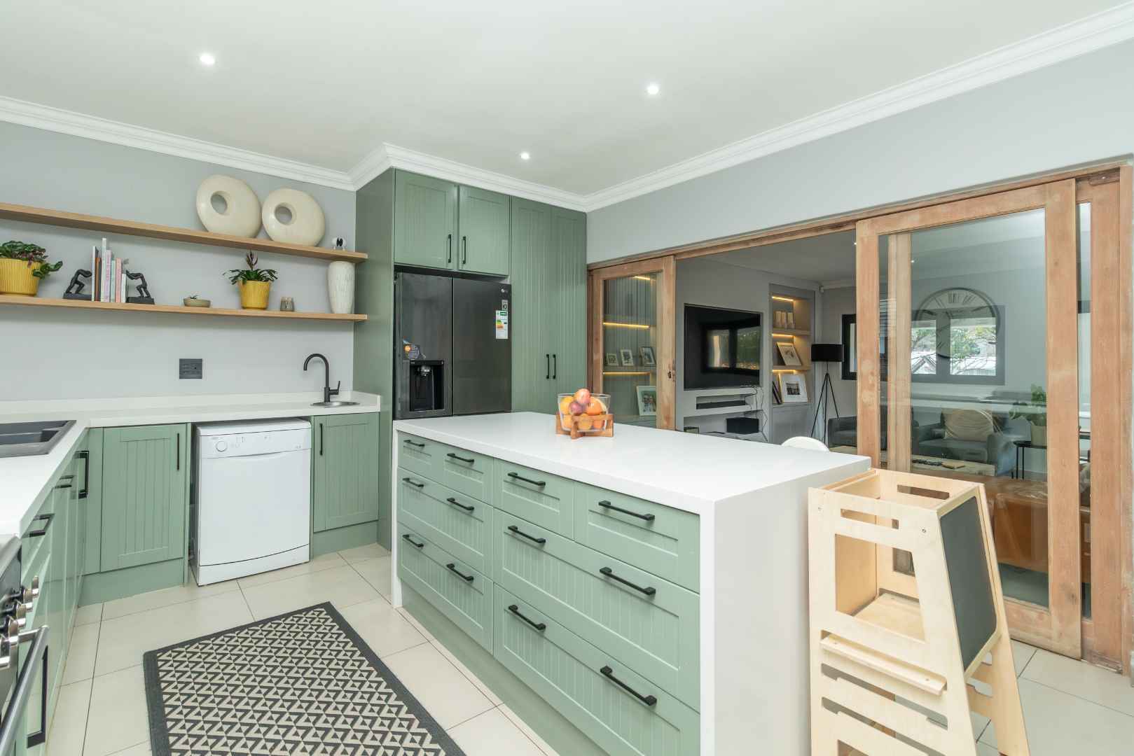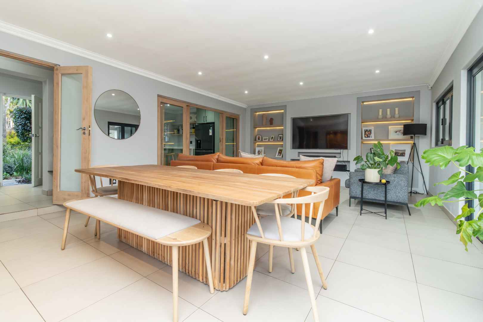When you walk through the front door you walk into the passage that goes into the living areas. On your left is the kitchen that has sliding doors going into the TV room. The TV room and Dining room is large and open plan. From the Dining room, you open stacking doors onto the large under cover patio and entertainment area.