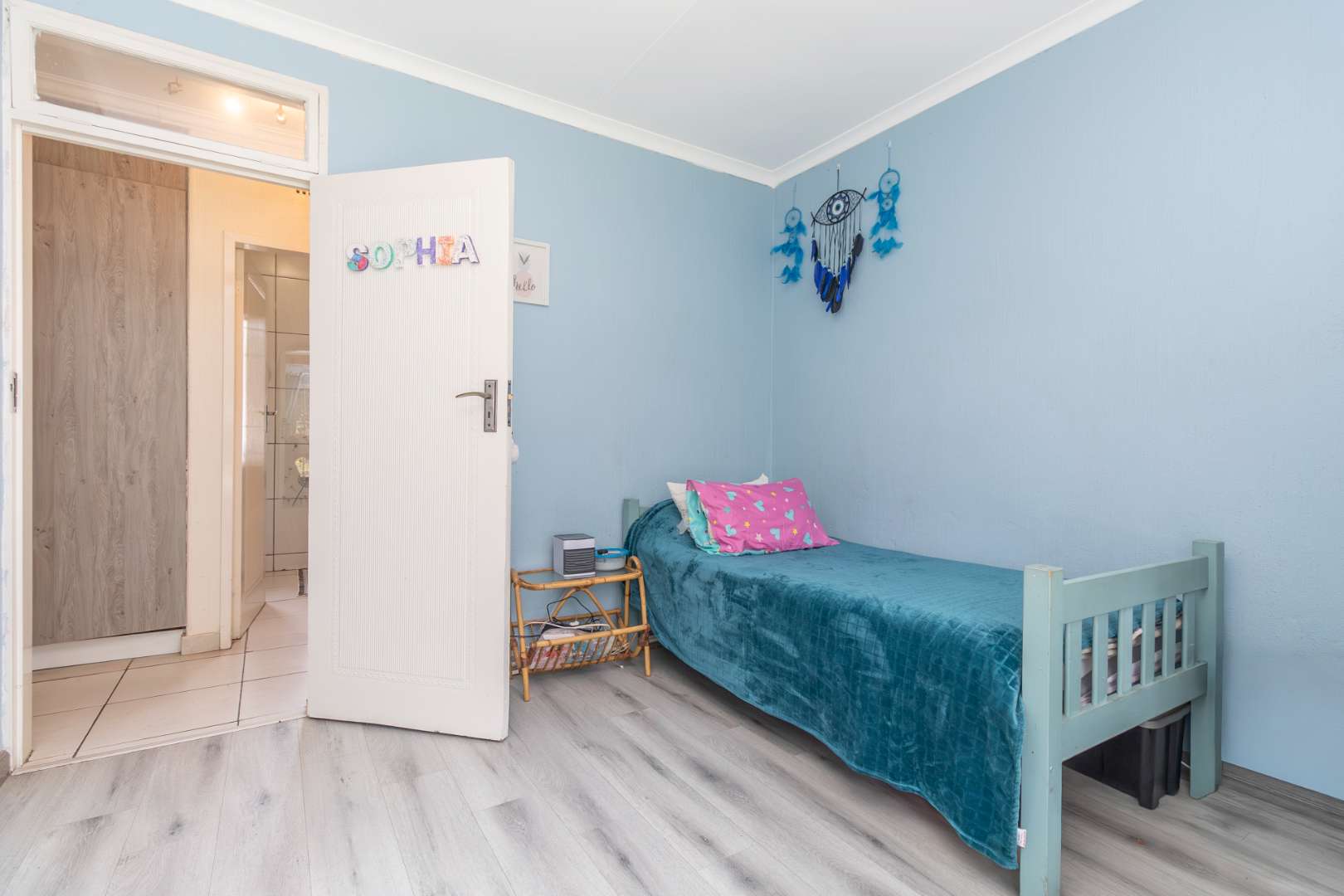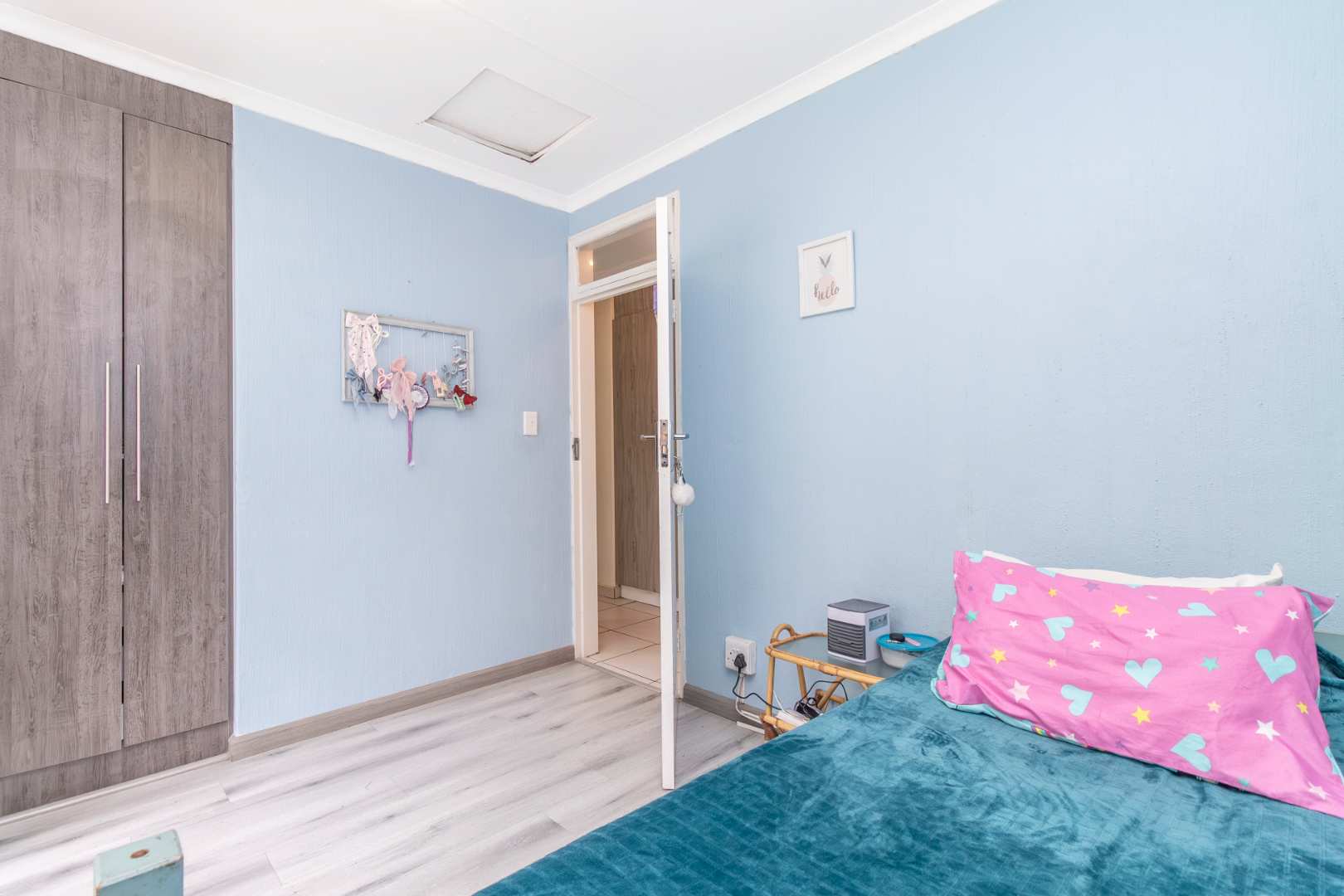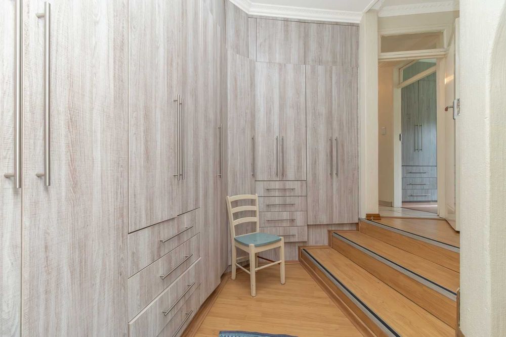Three bedrooms are downstairs. The second bathroom have a bath with shower in the bath. Bedrooms have laminated flooring and all bathrooms, bedrooms, passage and walk in cupboards in main bedroom have newly built and installed cupboards.