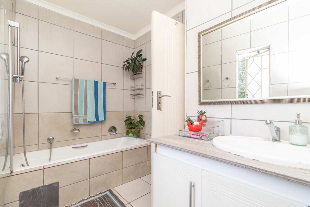 Downstairs is the kitchen with dining room attached to entertain guests. The TV room have large sliding doors opening up to an under cover patio with built in braai. The patio is overlooking the pool and spacious, well established garden.