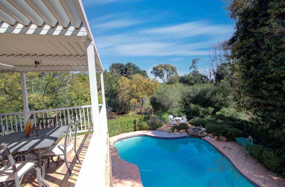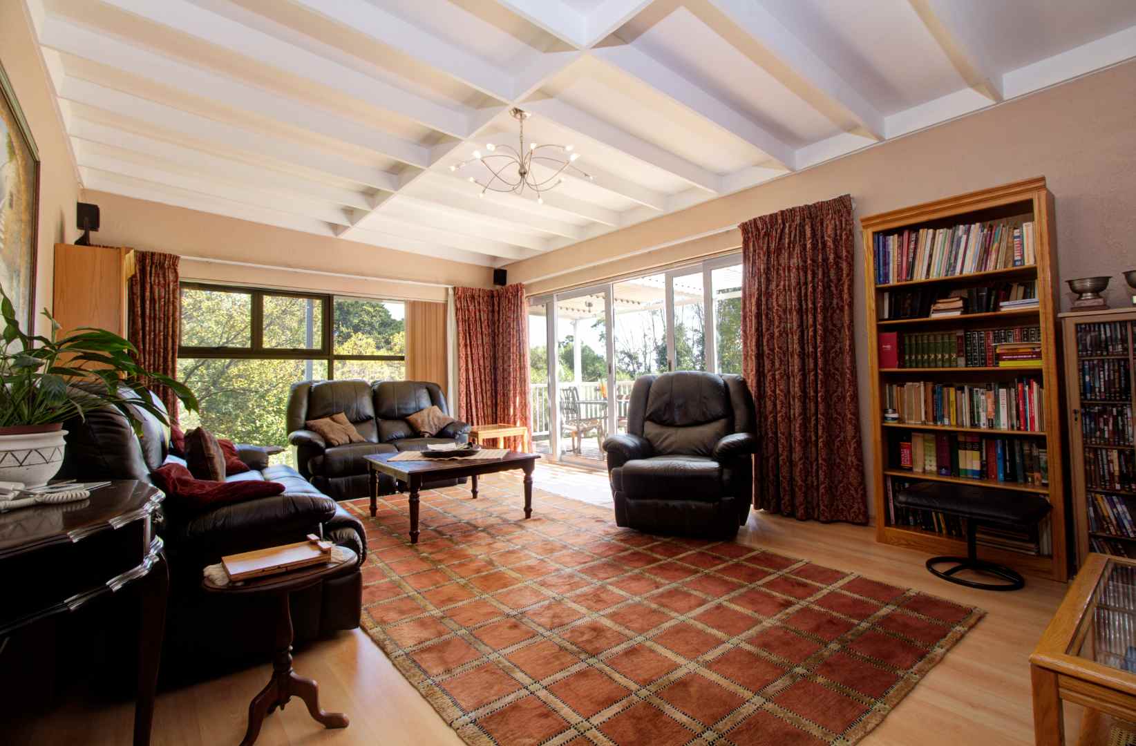 The living room leads onto a patio with louvre awning and which overlooks the fairy tale garden and sparkling pool.