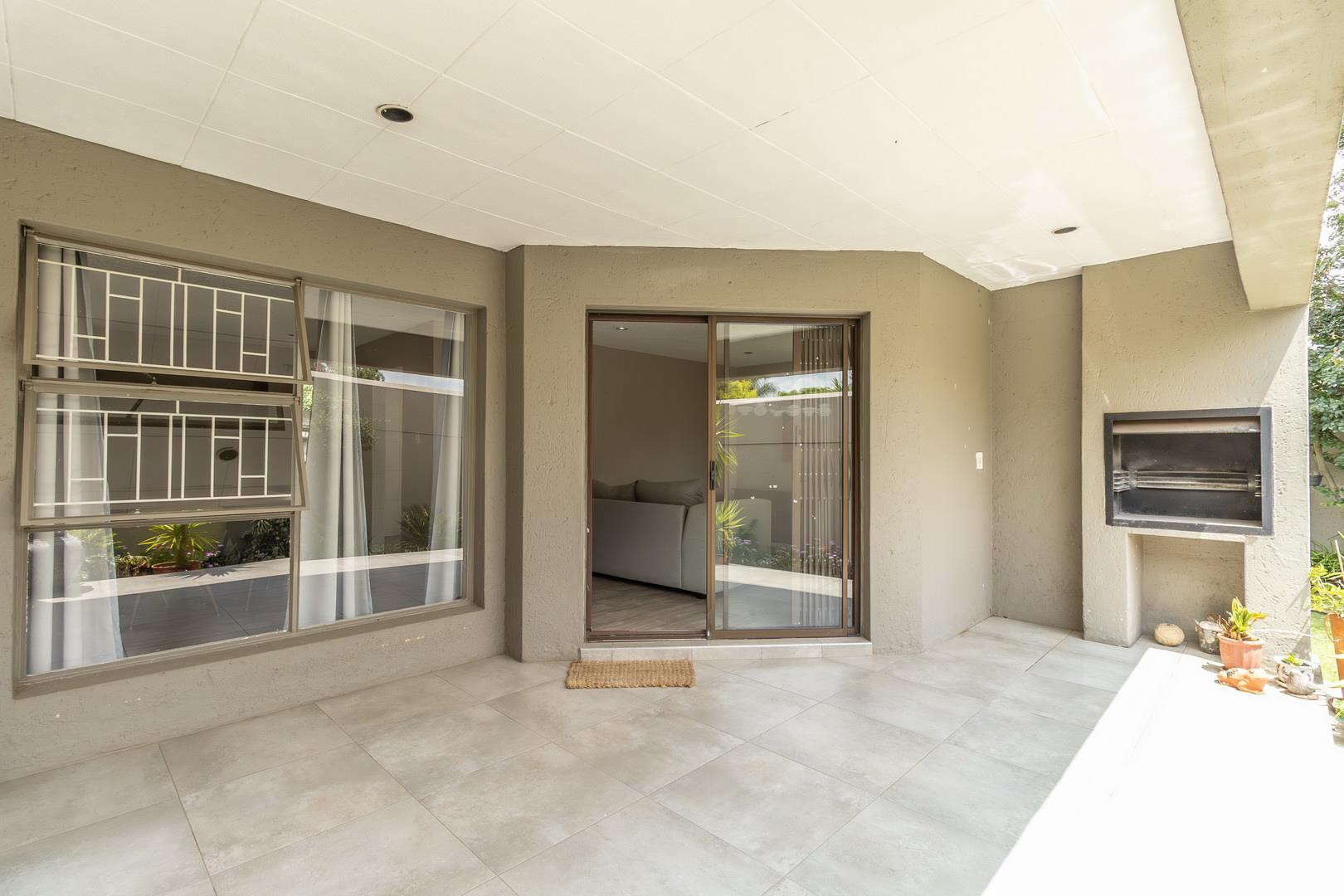 Spacious open plan lounge and dining room with a modern well equipped kitchen with granite tops. There are 2 Bedrooms and 2 bathrooms, main en suite. Double garage with automated door. Covered patio with a build-in braai and a pet friendly garden. Fibre installed. Close to all amenities and a few private schools makes this property a perfect choice. The 24/7 Security and cameras make it a safe place to stay. To view this unit, please call me without delay.