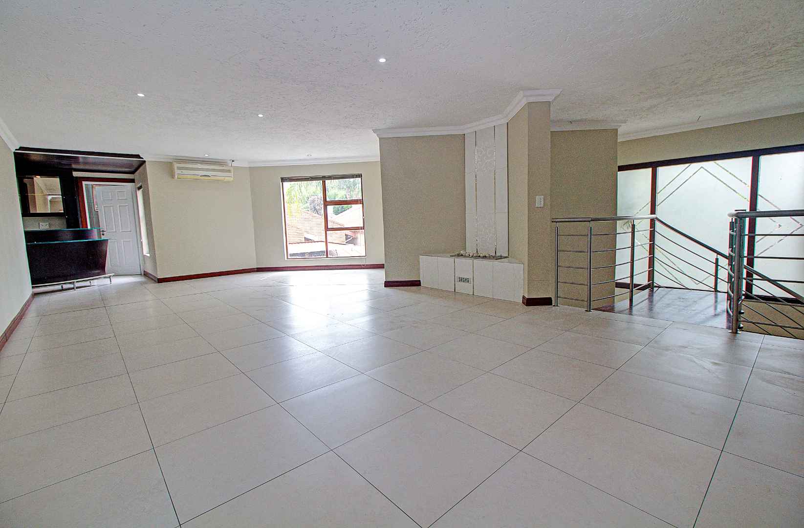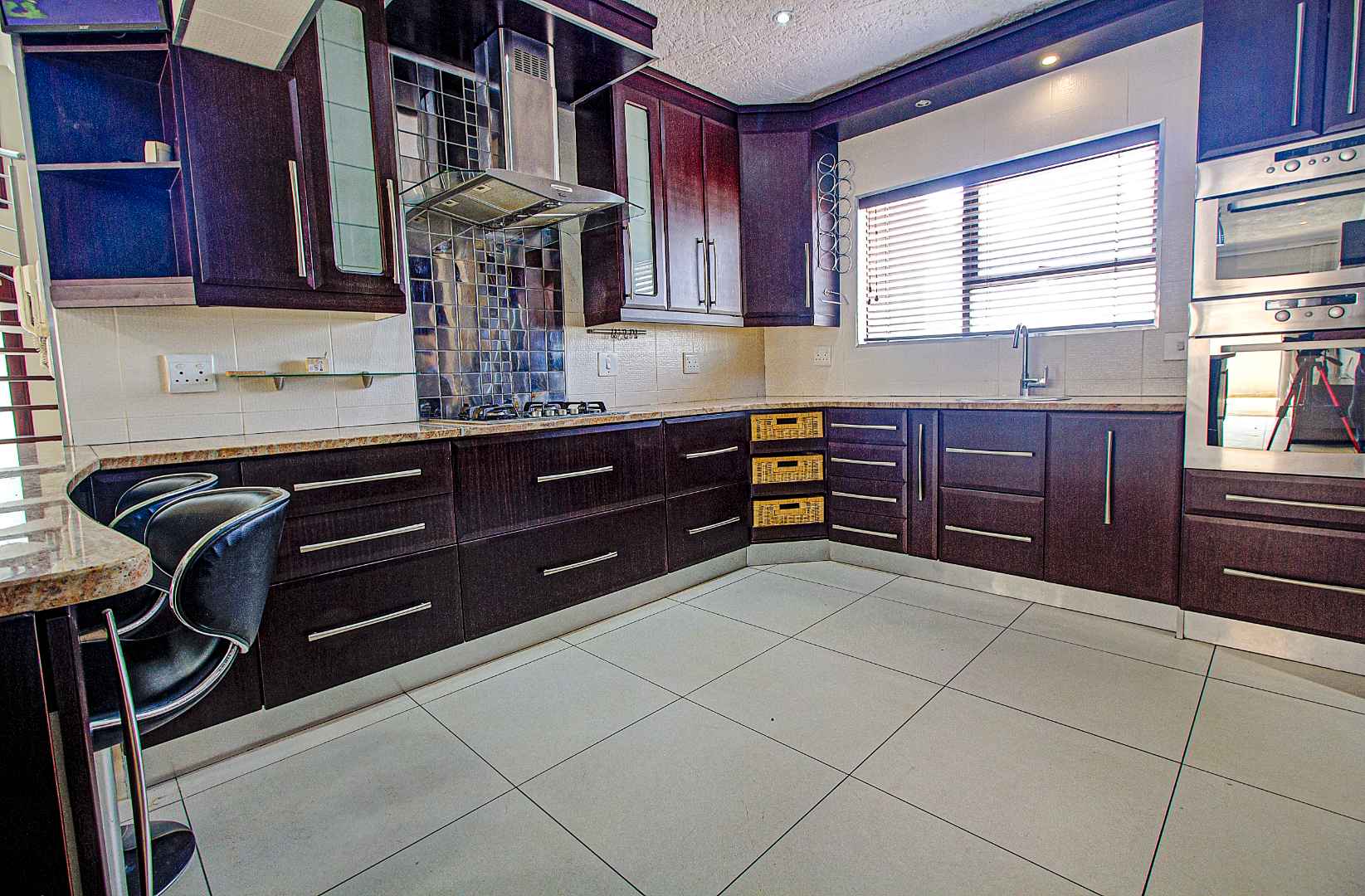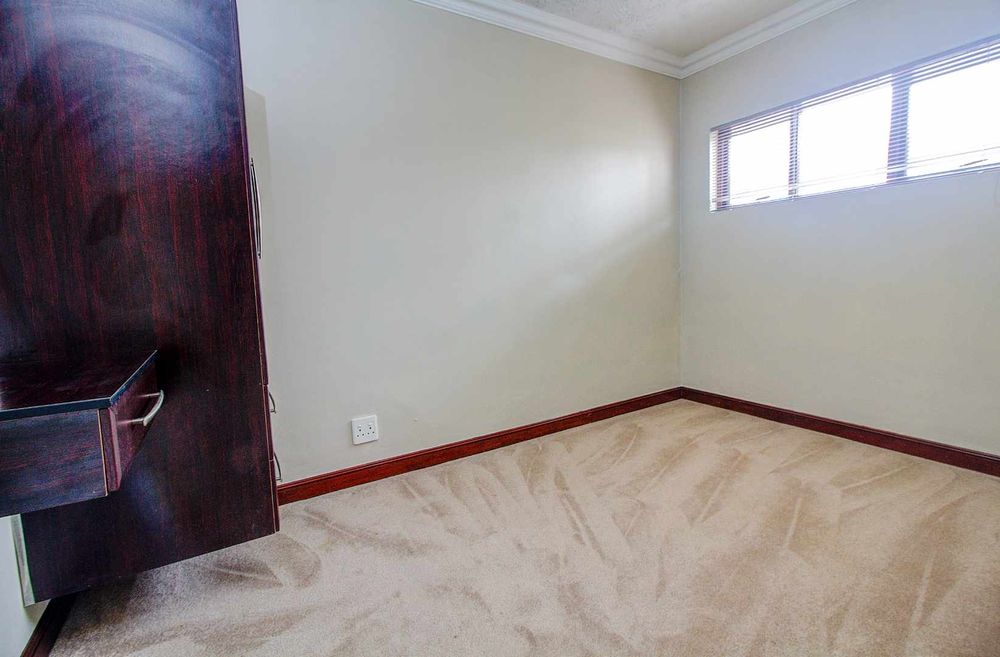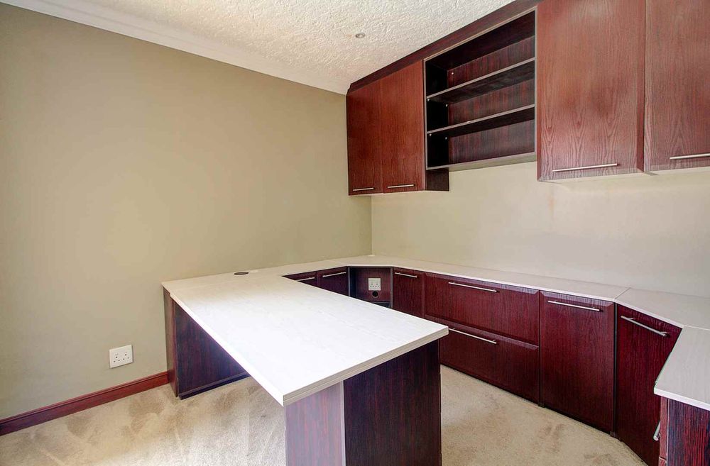 The open-plan living and dining area is beautifully tiled and seamlessly flows into a contemporary kitchen, complete with a gas hob and a convenient scullery area. This inviting space leads directly to the pool area, perfect for relaxation and entertainment. For those working from home, an adjacent office provides a quiet and functional workspace.