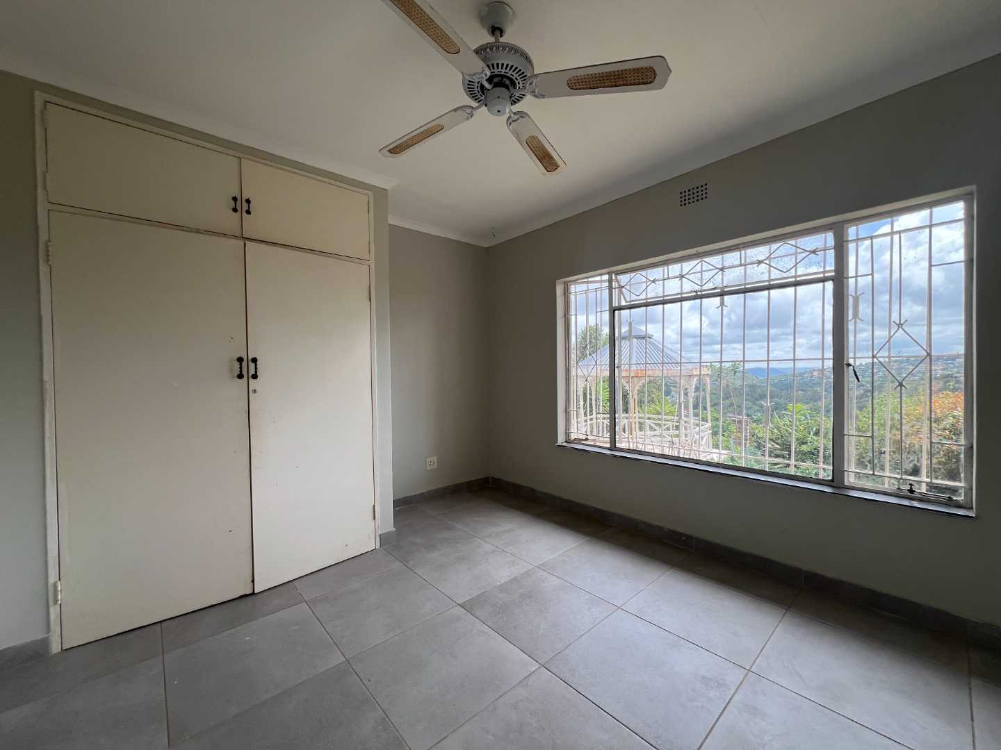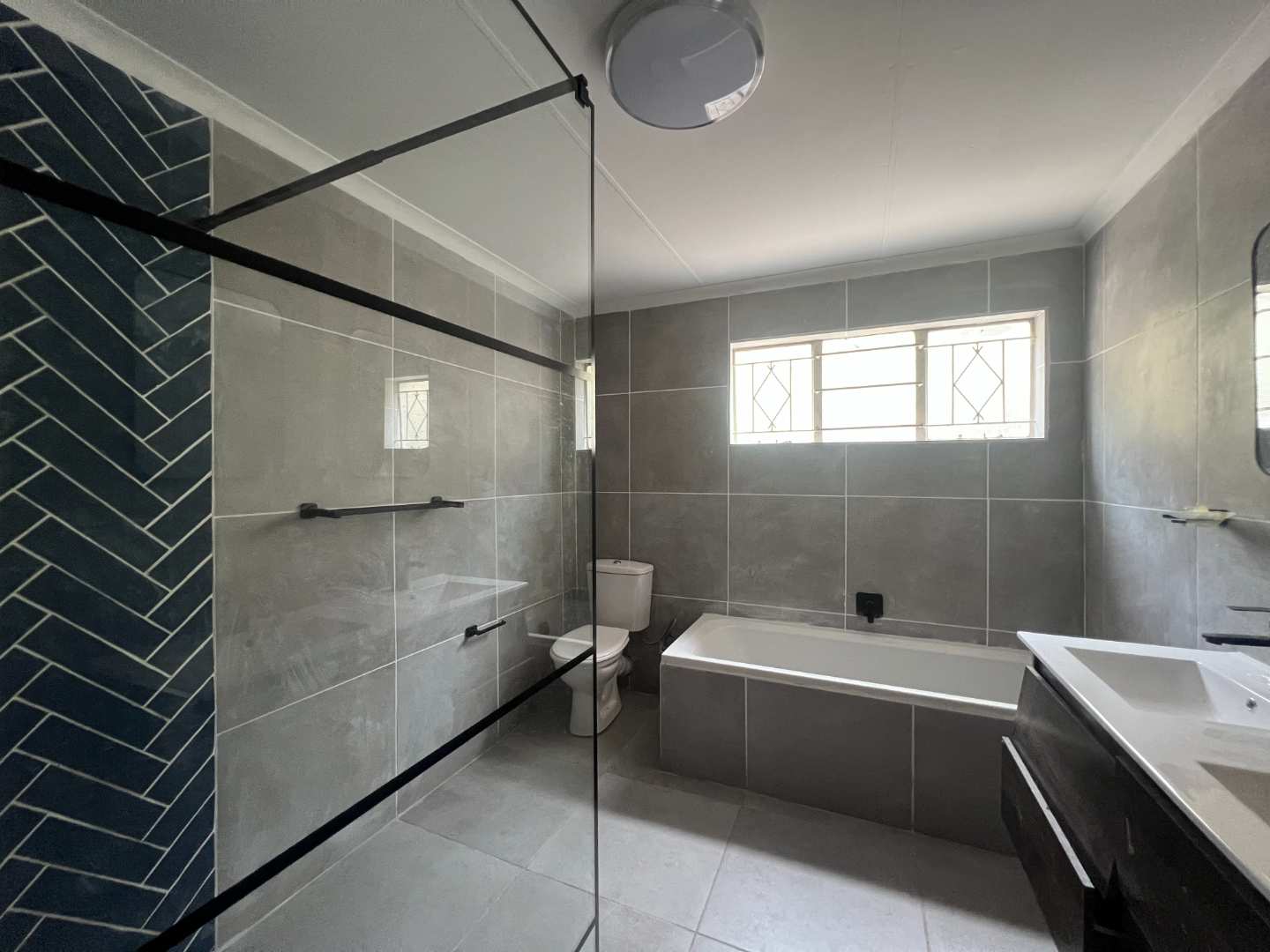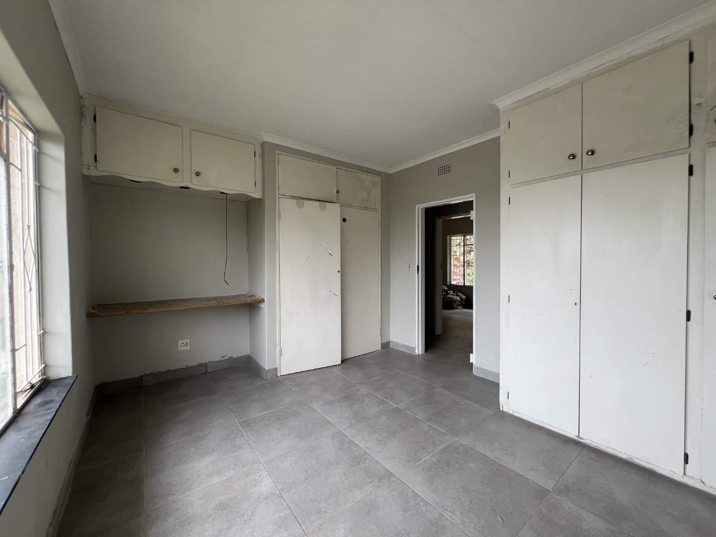 A newly designed kitchen offers trending wood finish formica tops and matt grey wrap cabinets with marble finish tiles for a classic yet modern look. The kitchen , although open plan is cleverly designed with a semi-private washing up area for everyday practicality and a back door out to the open back yard.
