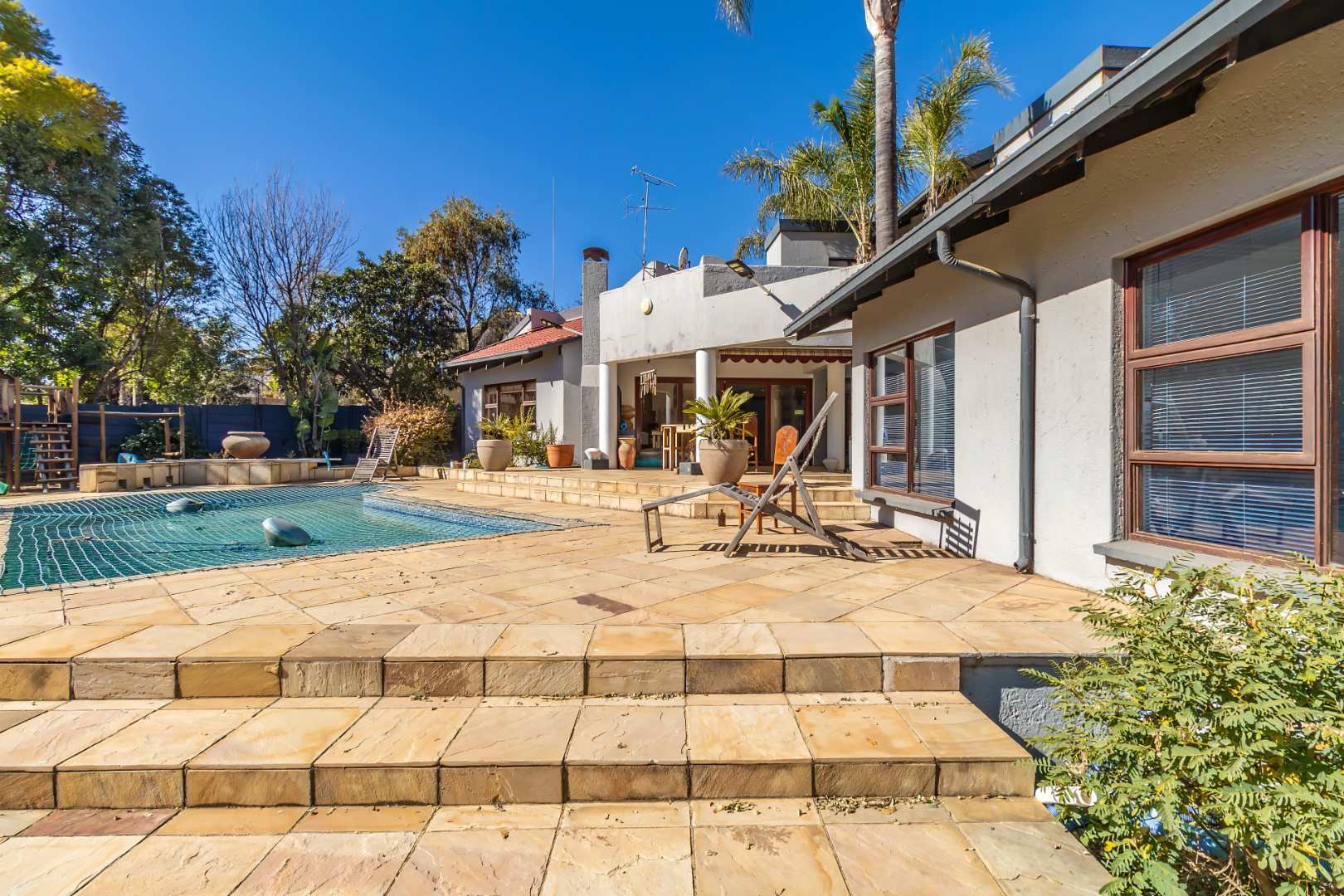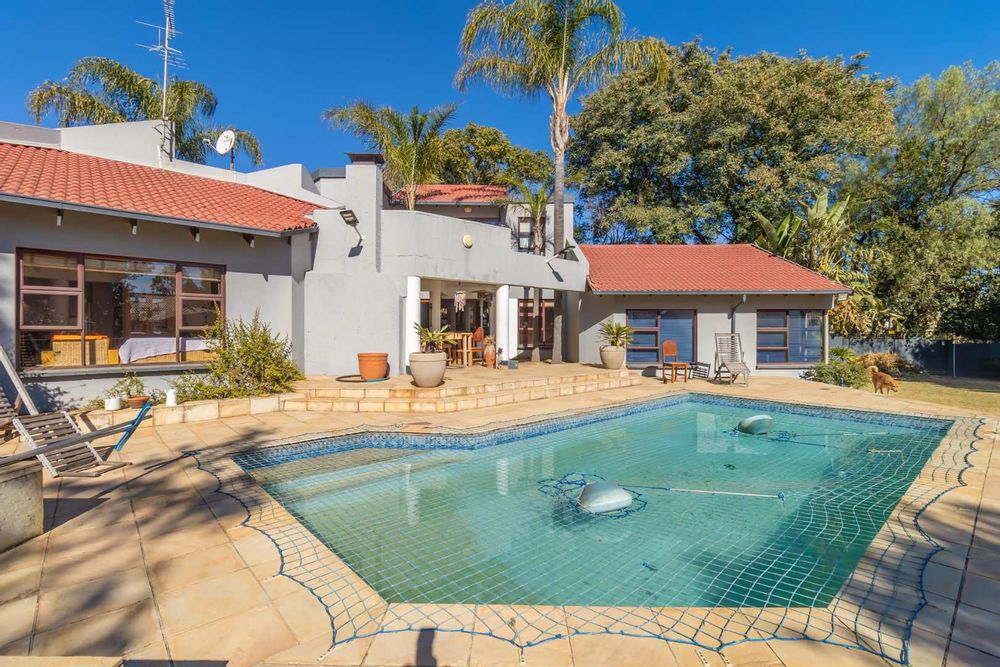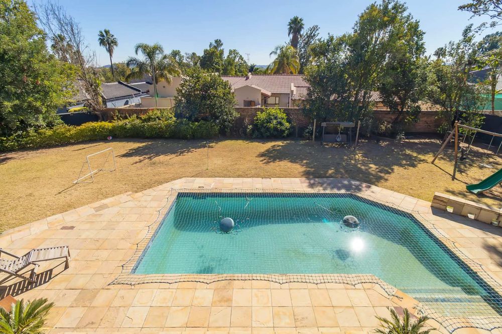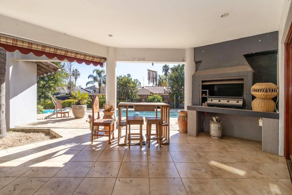 From the passages and the TV area, there's glass doors opening up onto a large under cover patio. There's a gas built-in braai with large garden, pool and kids jungle gym.