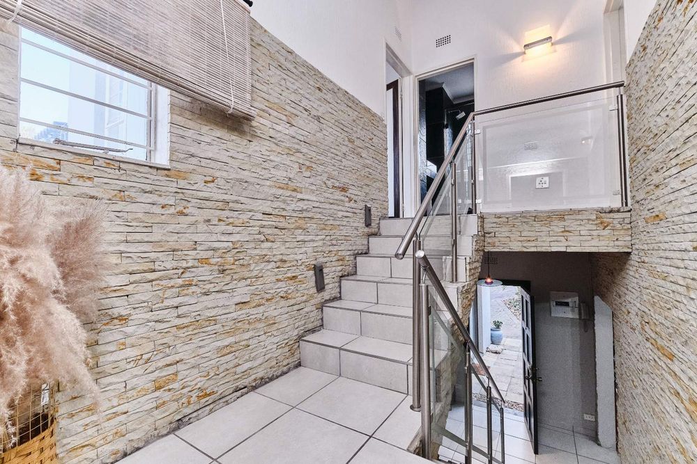 Looking at the rest of the property you will notice that a lot of time and effort has been put in with the design elements chosen. The staircase has been rounded off with stone cladding to give it a warm and inviting atmosphere. The original hand rales have been replaced by a glass and metal combination giving that elegant feeling even more throughout this home. Downstairs you will find an expansive living room area that walks out onto your patio and garden area. Stacker doors have been installed which brings the outdoors in, as well as a double side door overlooking the private pool.