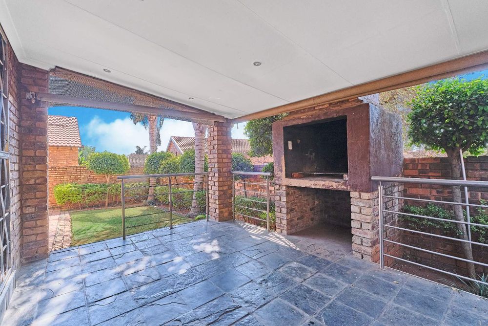 From the living area, you are seamlessly led to the outdoor covered patio, an ideal space for entertaining or relaxing. This area features a built-in braai, downlights, canvas roller blinds, and designer railings. The beautifully landscaped garden enhances the exterior appeal of the home, creating a serene and picturesque environment.
