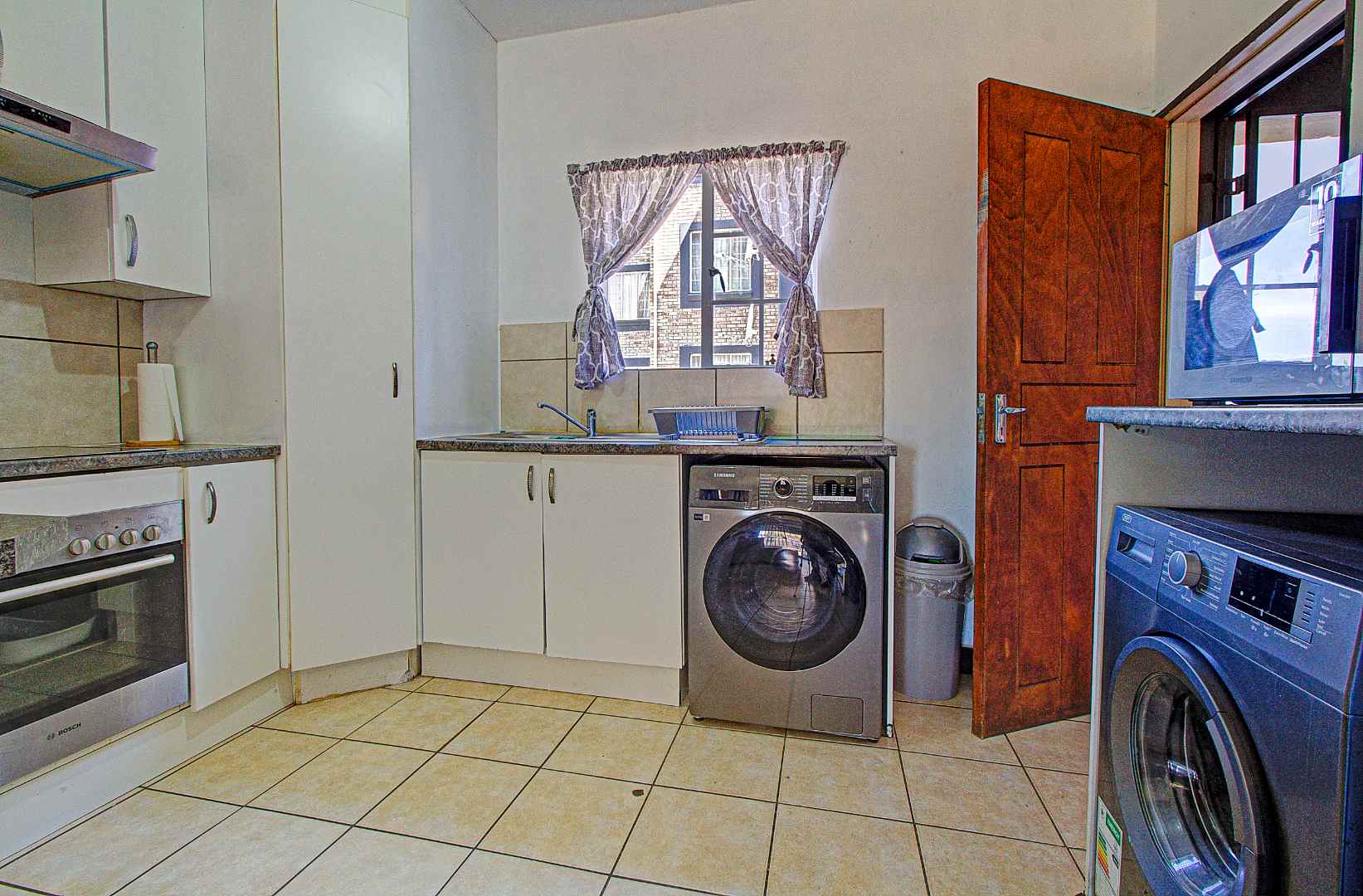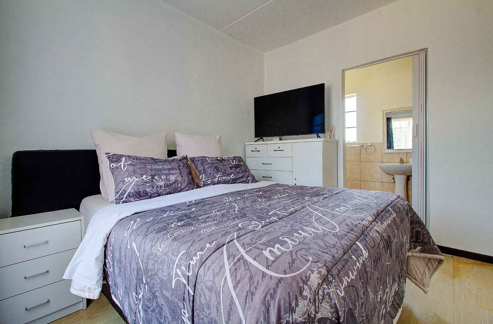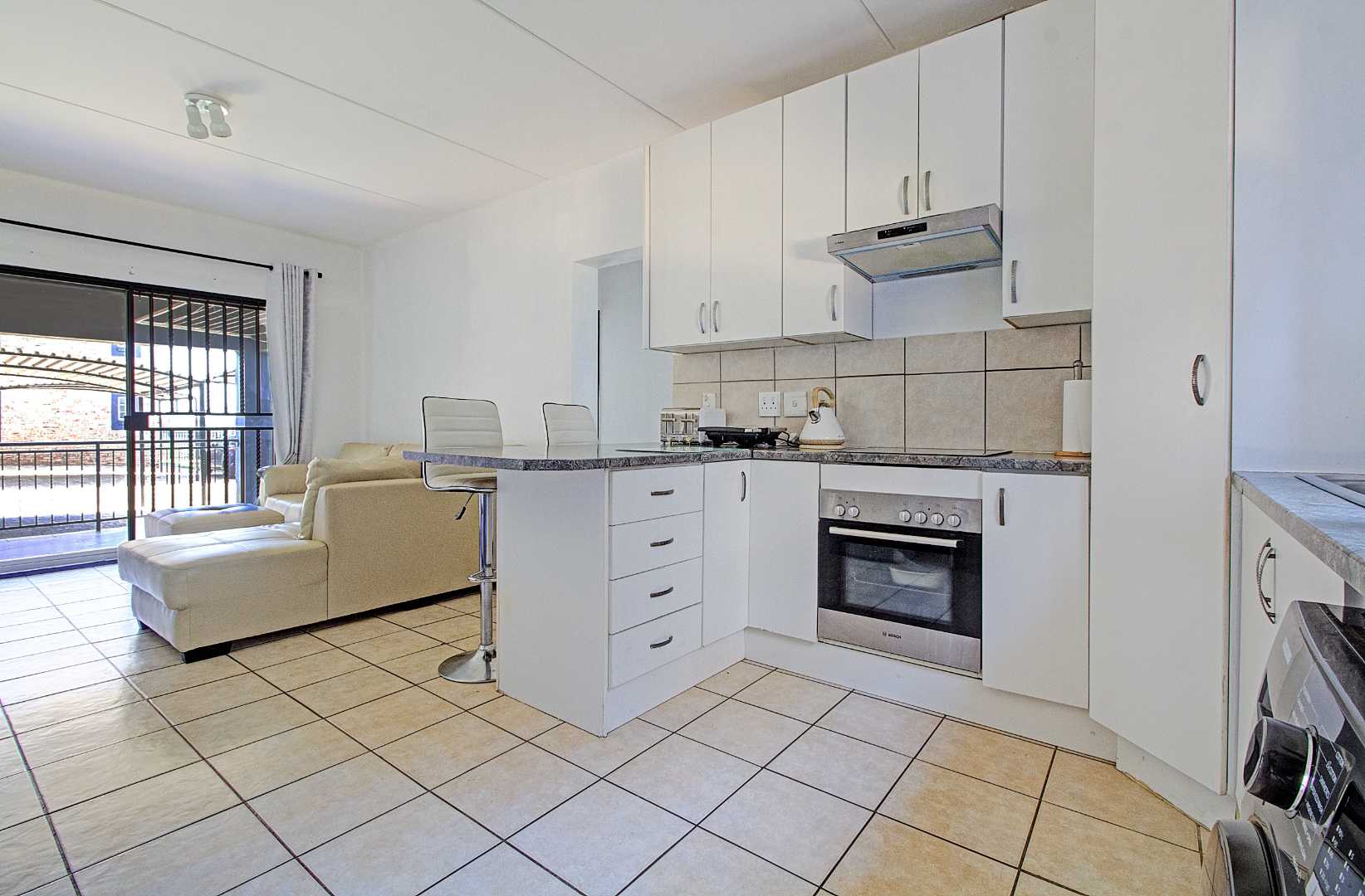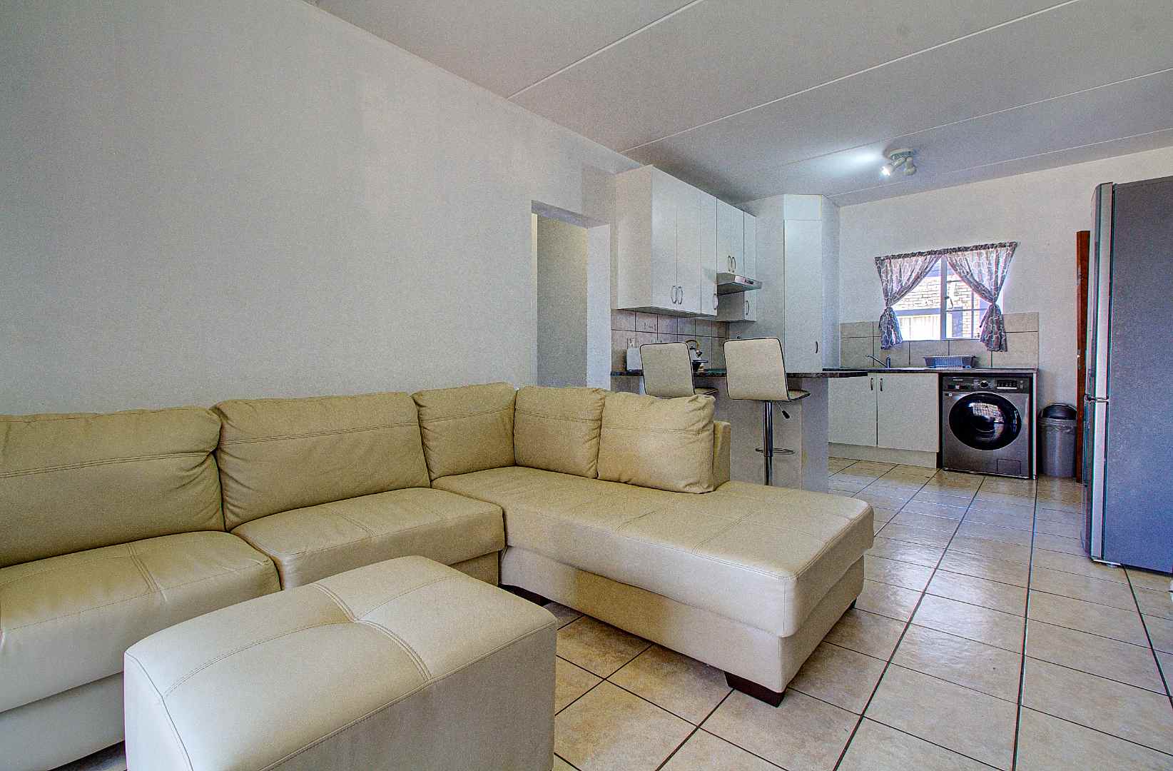The kitchen seamlessly transitions into the open-plan living room, creating a spacious and inviting atmosphere. Both areas are adorned with easy-to-maintain tiles, enhancing the home's modern appeal. From the living room, step out onto your private covered patio, complete with a built-in braai—perfect for entertaining guests or enjoying a peaceful evening outdoors.