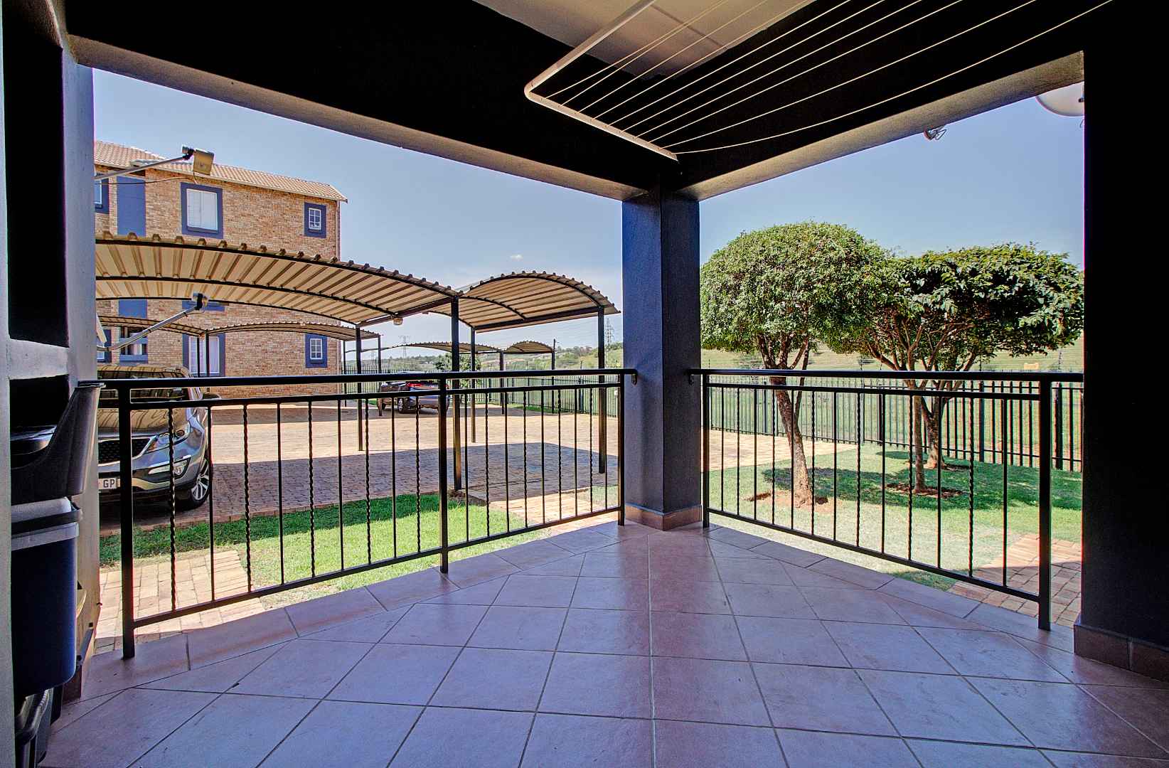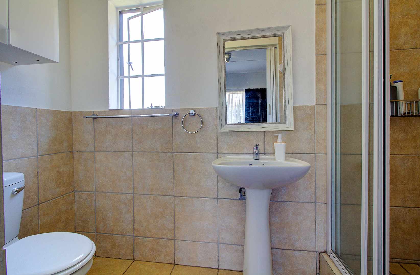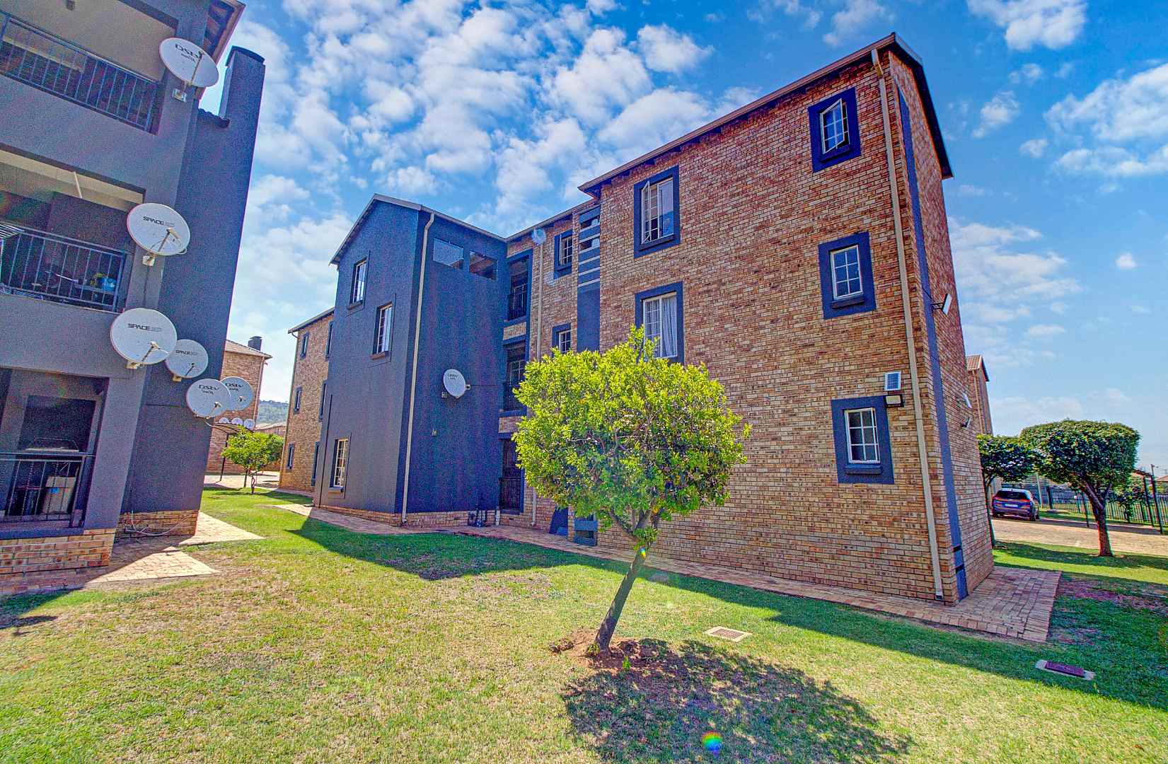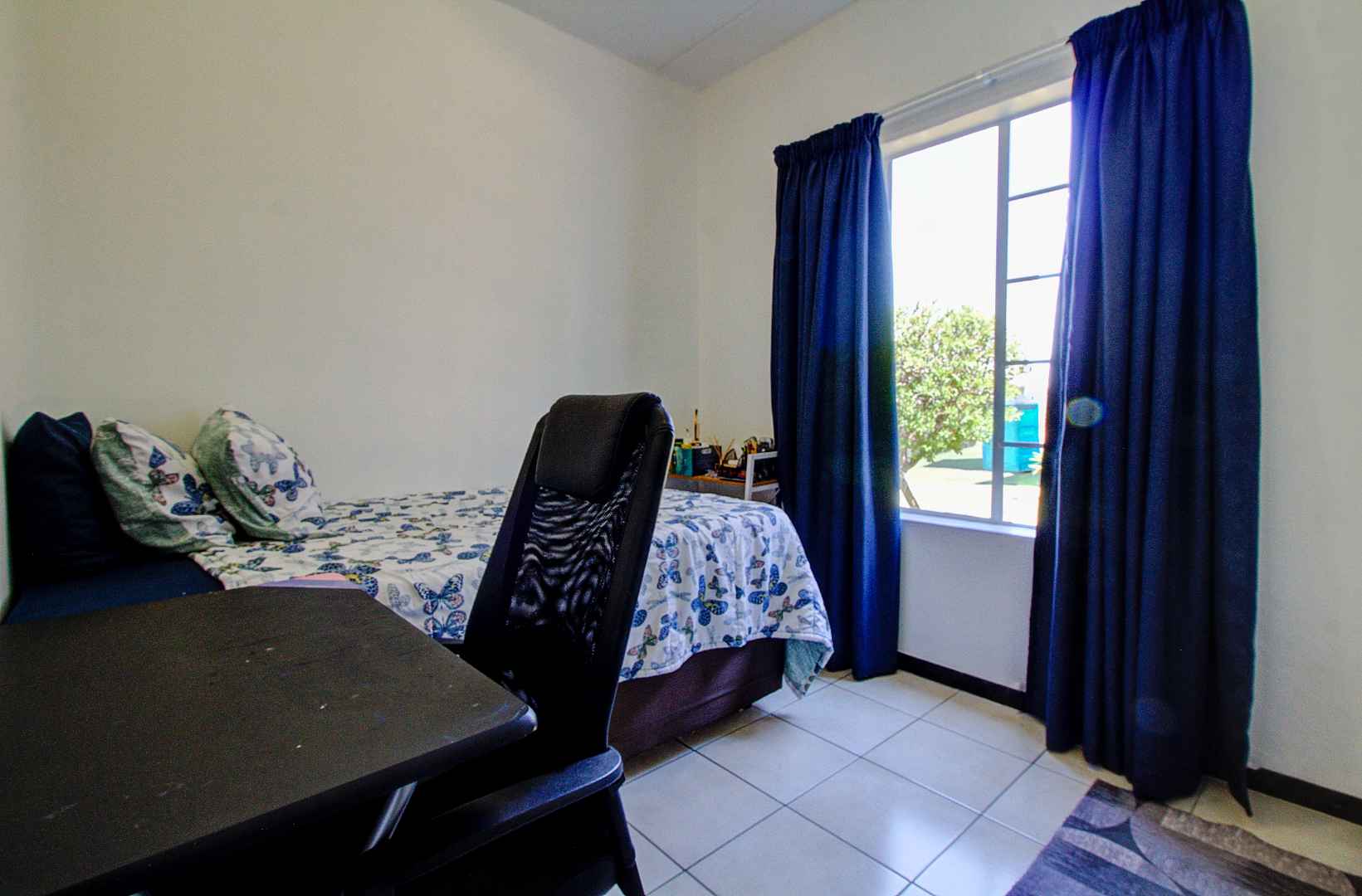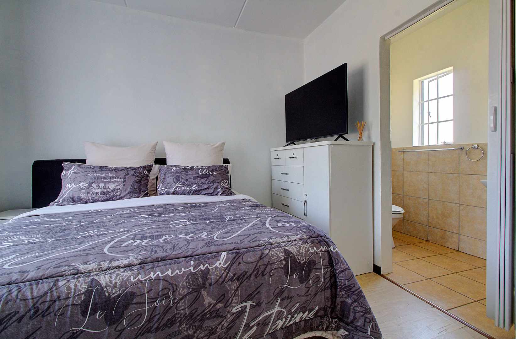 The kitchen seamlessly transitions into the open-plan living room, creating a spacious and inviting atmosphere. Both areas are adorned with easy-to-maintain tiles, enhancing the home's modern appeal. From the living room, step out onto your private covered patio, complete with a built-in braai—perfect for entertaining guests or enjoying a peaceful evening outdoors.