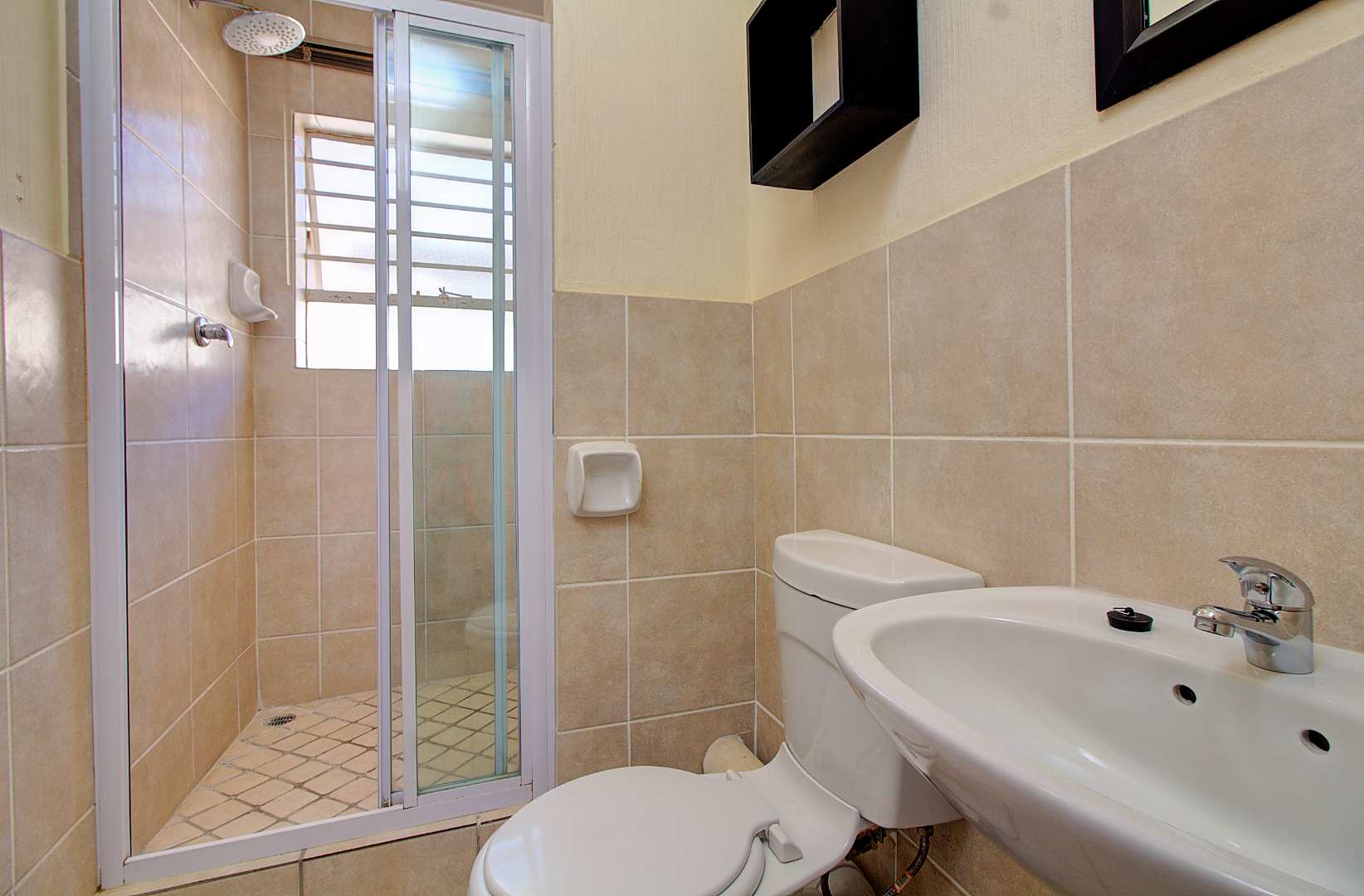 This well-maintained property boasts three spacious, tiled bedrooms, each equipped with built-in cupboards. The home features two bathrooms—two conveniently located upstairs and a visitor's bathroom downstairs. The main bedroom includes an en-suite bathroom and opens onto a closed patio, perfect for use as a study or private retreat.
