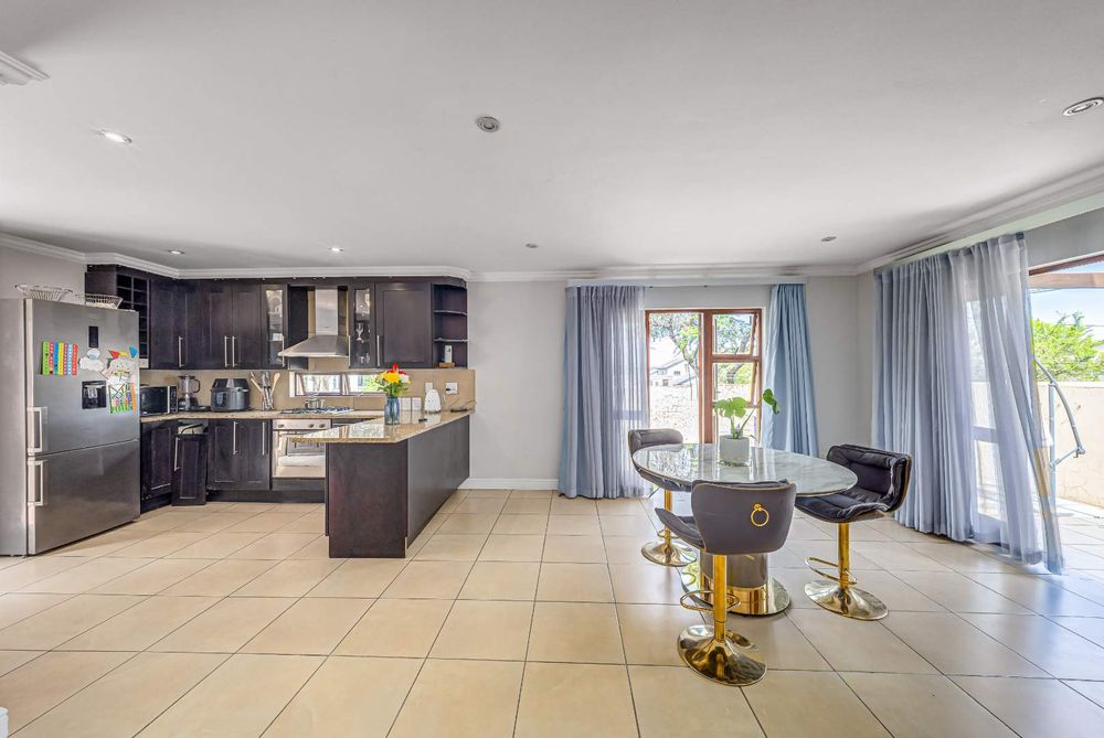 Downstairs the open-plan L-shaped kitchen, dining, and living area with fireplace is the heart of the home whose well designed space suits both daily family living and entertaining guests during warm and cooler days. In addition, the home features a patio with built-in-braai for delightful outdoor dining and a pool for a refreshing escape in summer. For your budgeting convenience there is no special levy and the average monthly cost for municipal services (refuse collection, water and sanitation) is R1641.